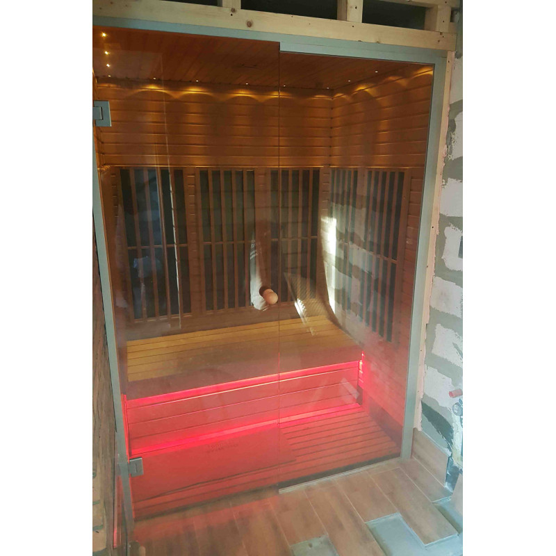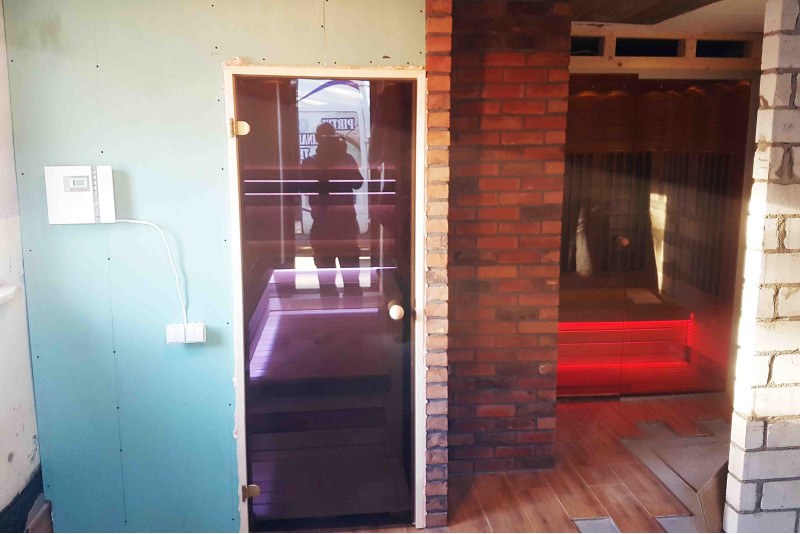 Sauna equipment: Infrared heater HARVIA CARBON with protective grille, control panel Harvia Griffin Infra CG170I. This panel can be used to control operating time, temperature, lighting and ventilation. The timer can be used to set when the sauna should be ready. The chrome digital control panel is perfectly compatible with other modern sauna equipment.