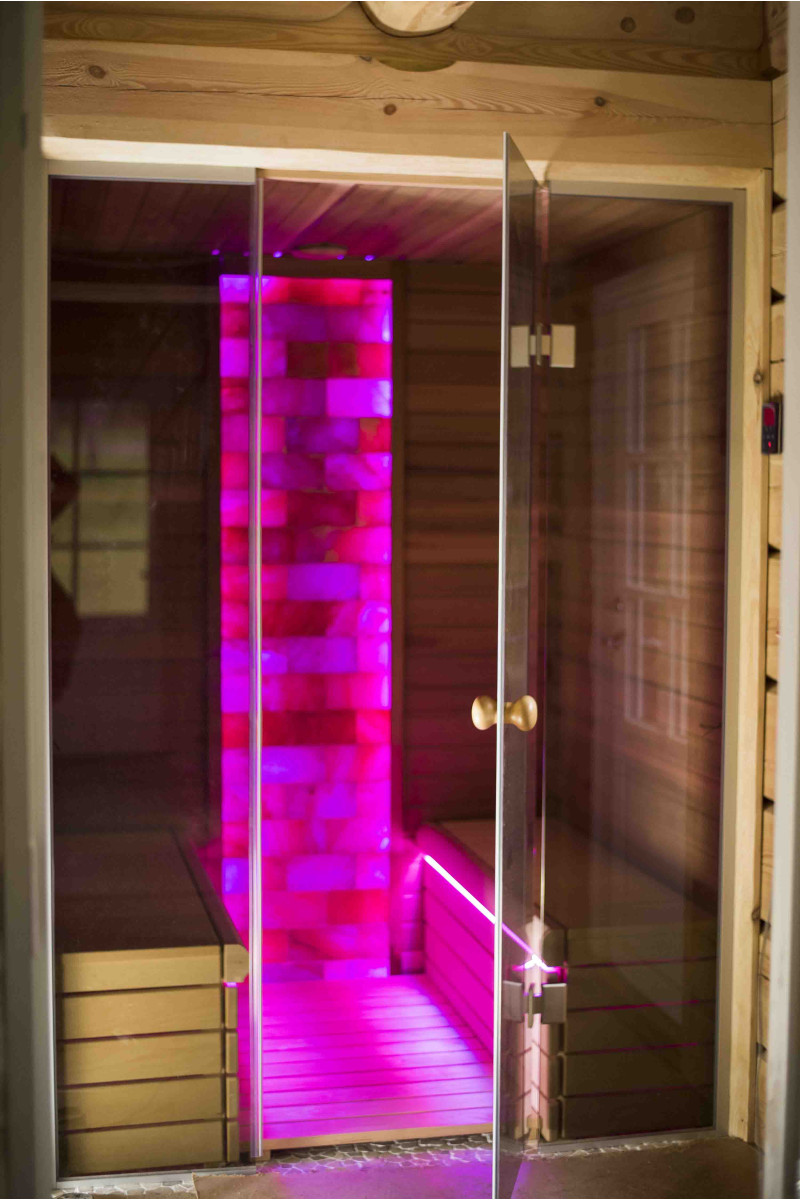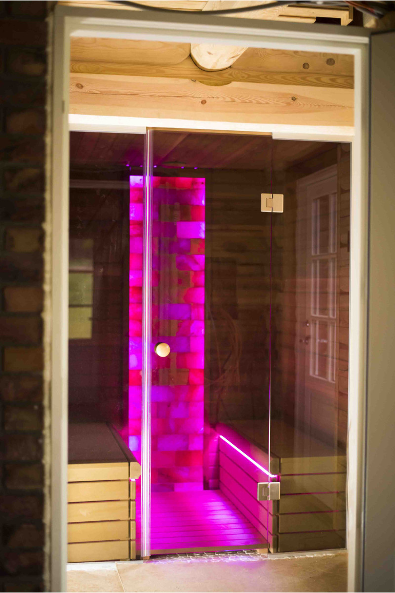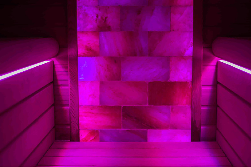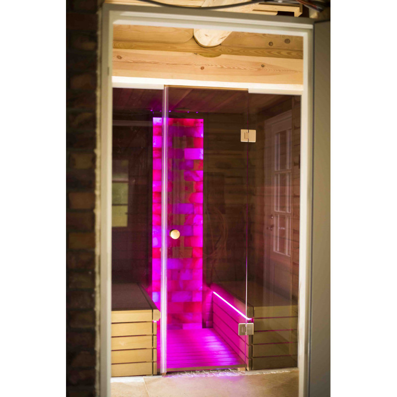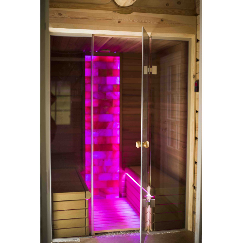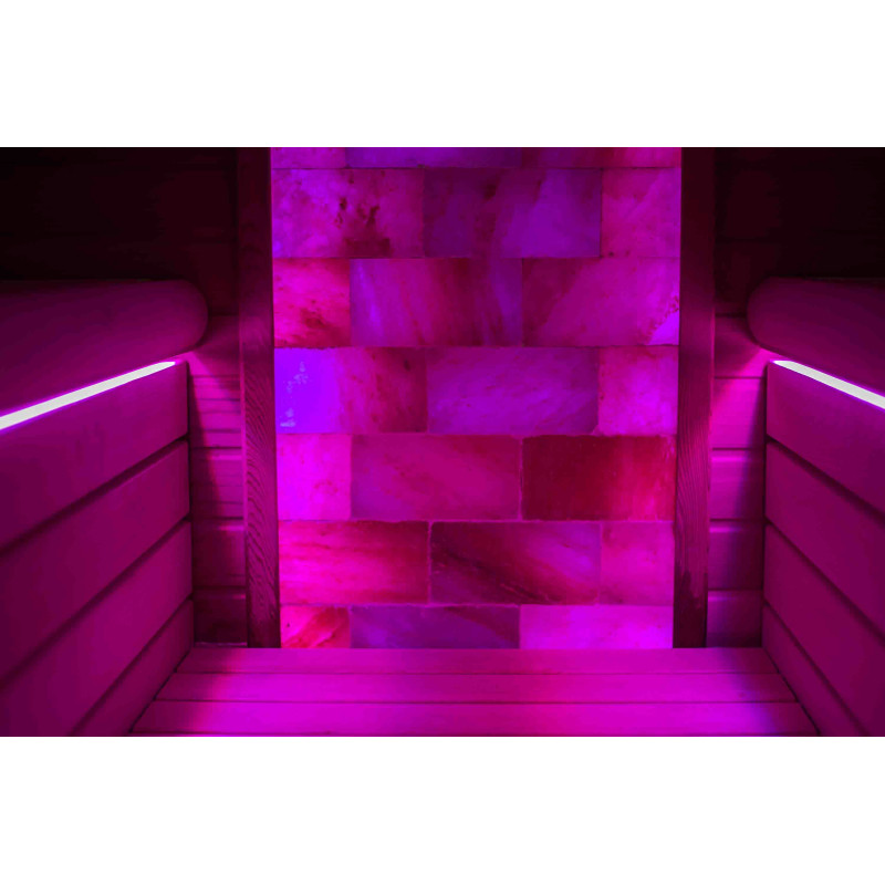 The Himalayan salt brick wall chosen for the decoration of the sauna with the built-in colored RGB lighting, controlled by a wireless color changer, creates a cozy environment and further enhances the effect of the sauna.