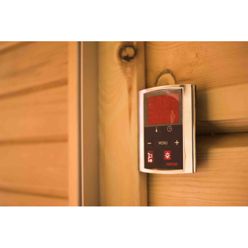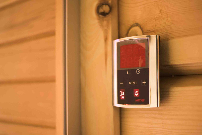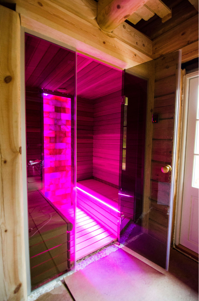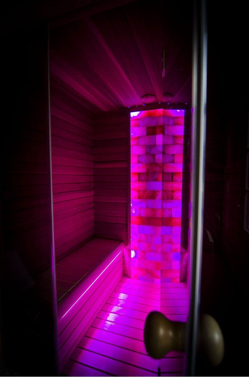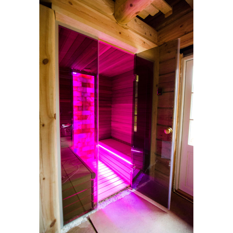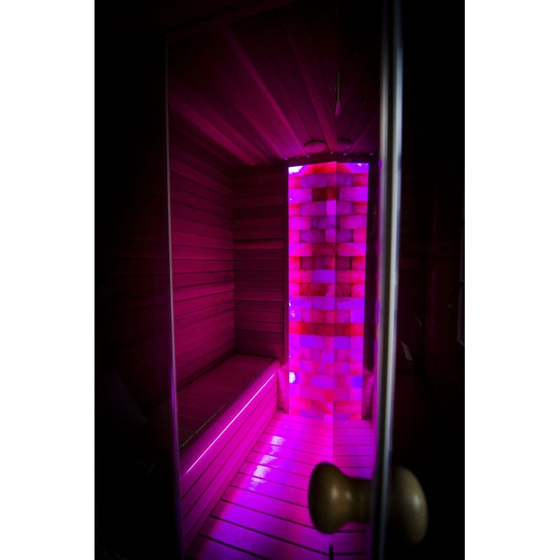 The Himalayan salt brick wall chosen for the decoration of the sauna with the built-in colored RGB lighting, controlled by a wireless color changer, creates a cozy environment and further enhances the effect of the sauna.