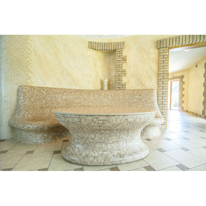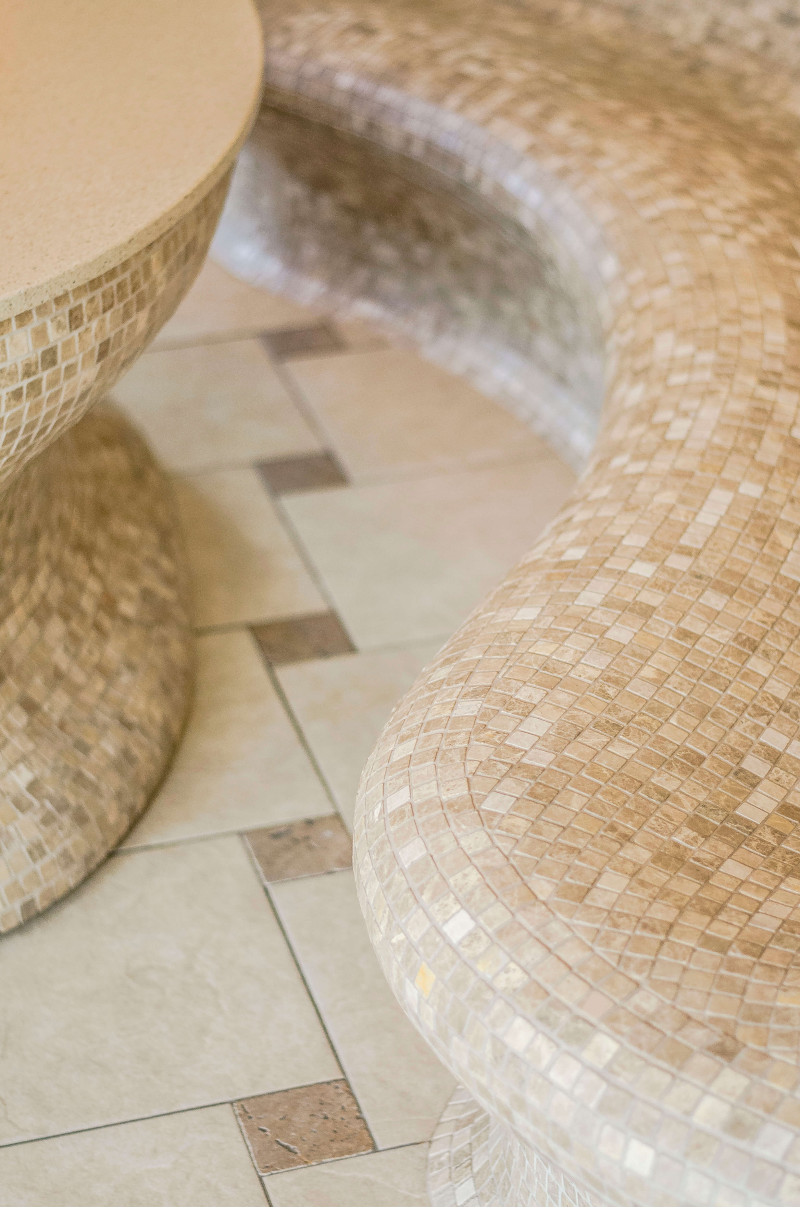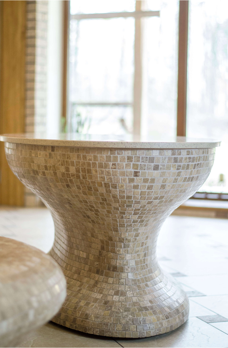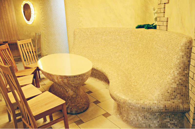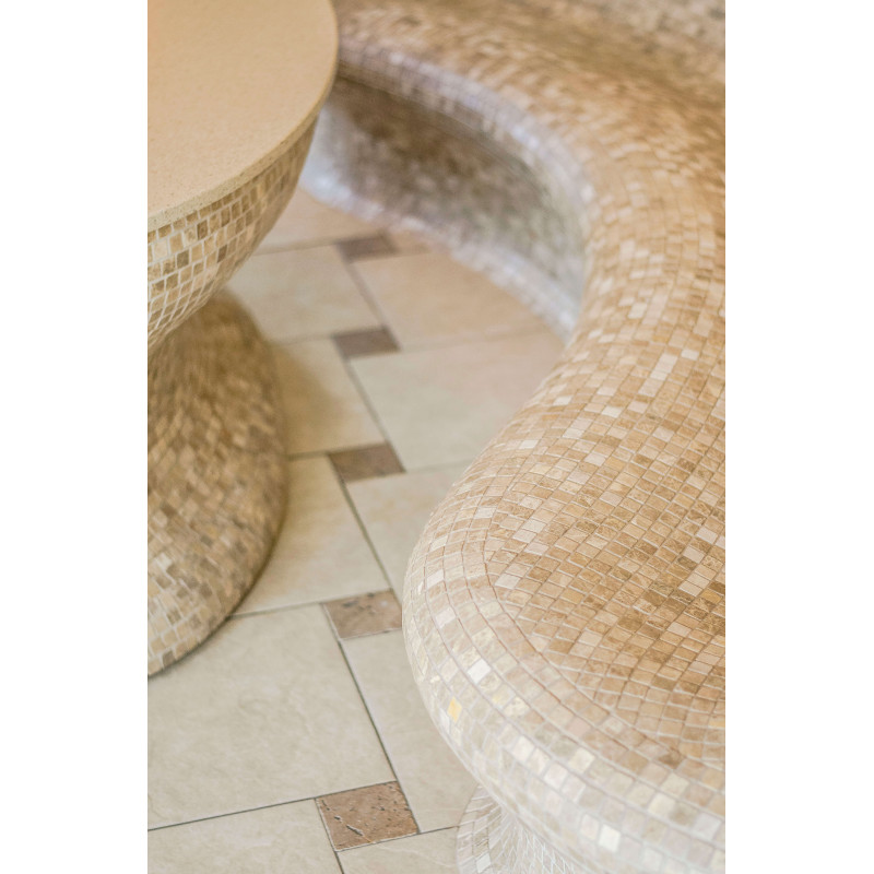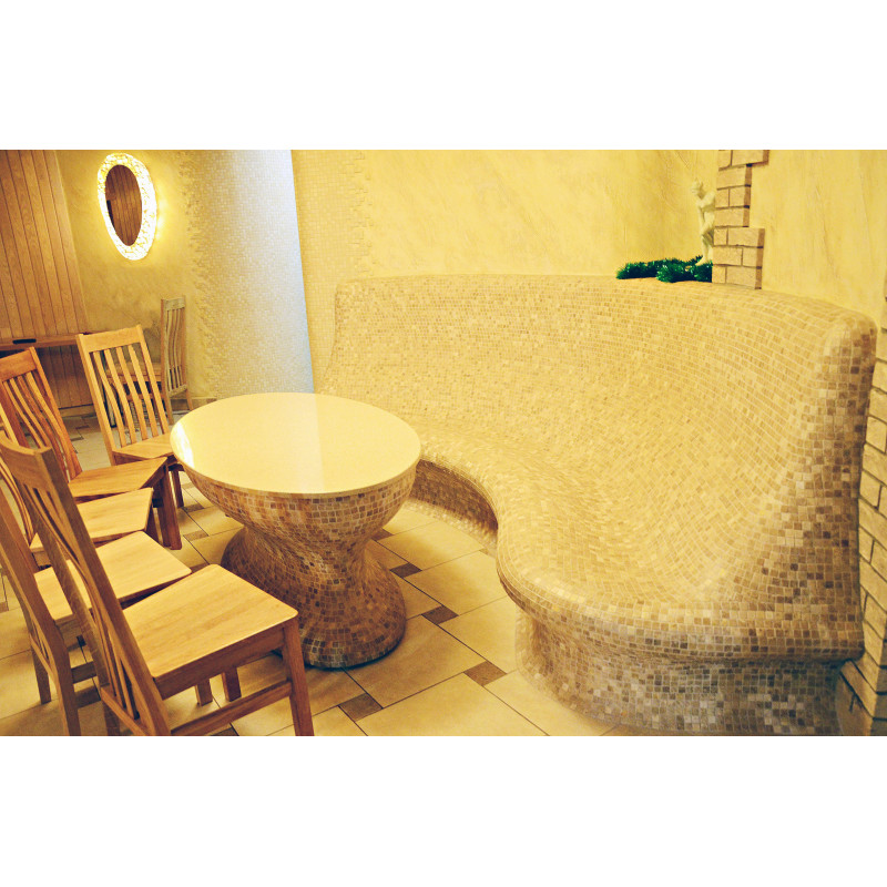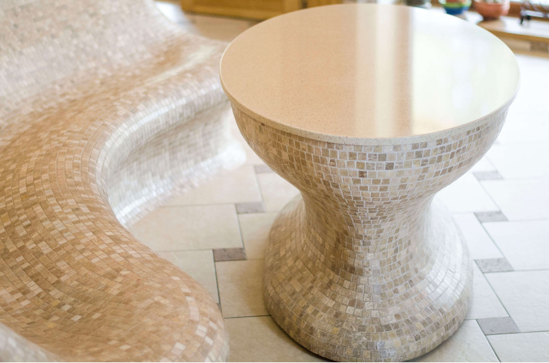 Heated bench and table shapes are made individually from special extruded polystyrene. Countertop - marble. Finish - mosaic tiles. The bench is heated from the heating system.