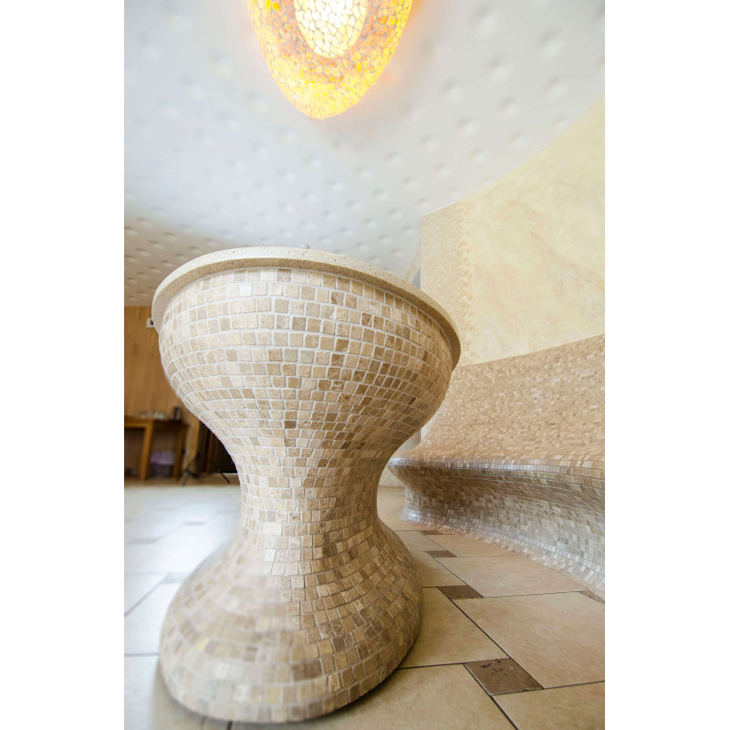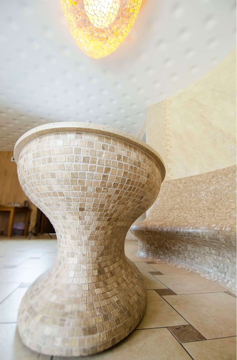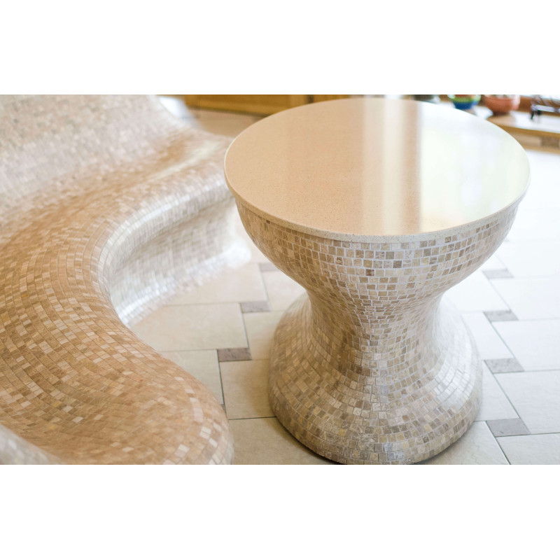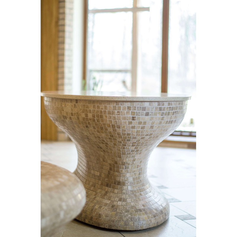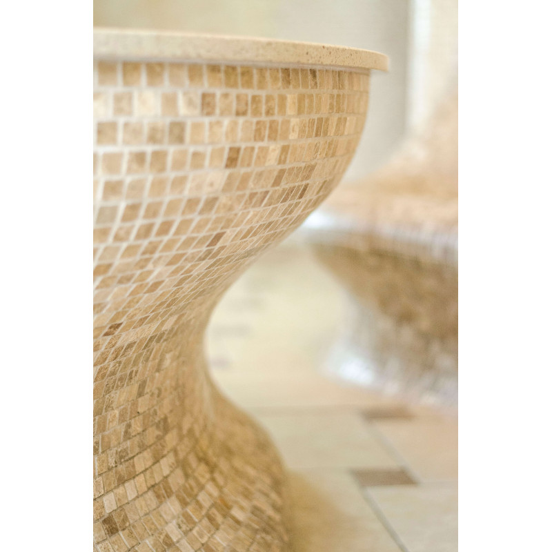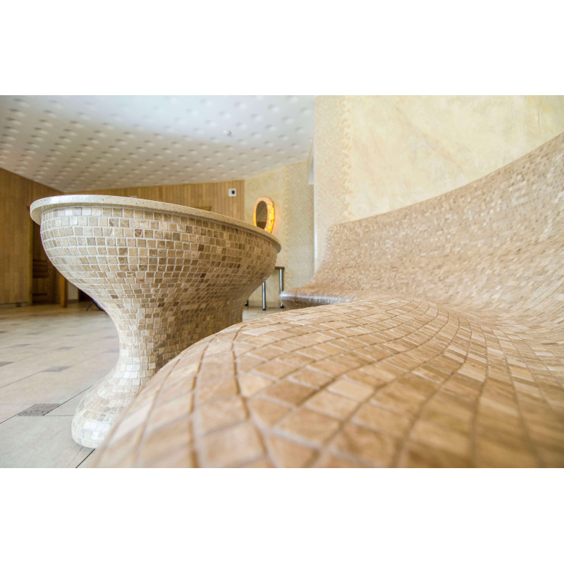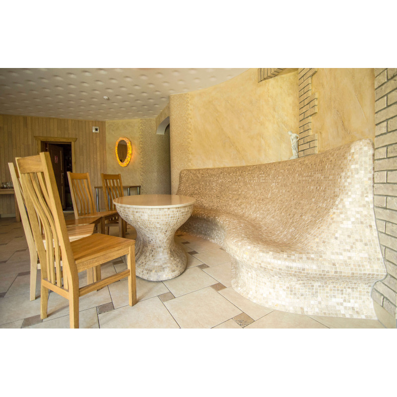 Heated bench and table shapes are made individually from special extruded polystyrene. Countertop - marble. Finish - mosaic tiles. The bench is heated from the heating system.