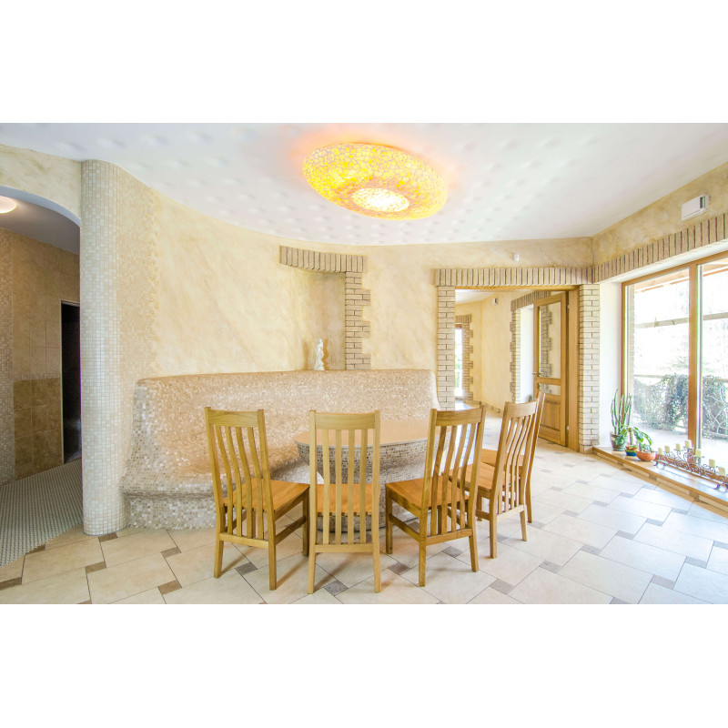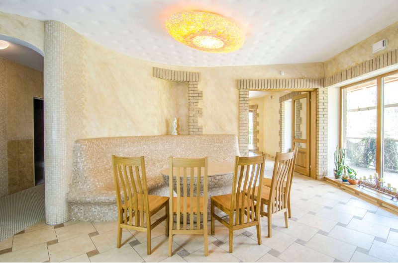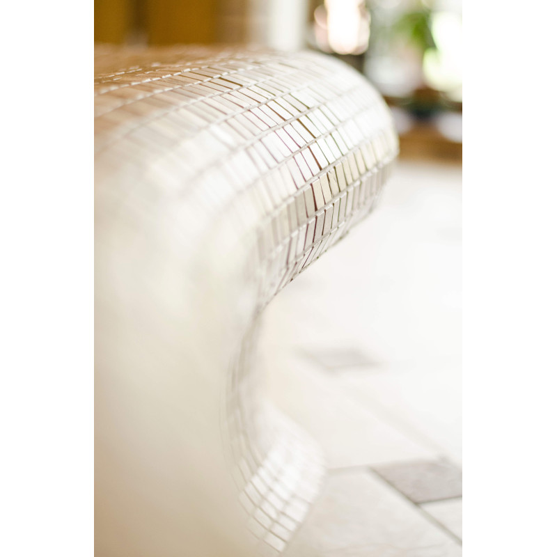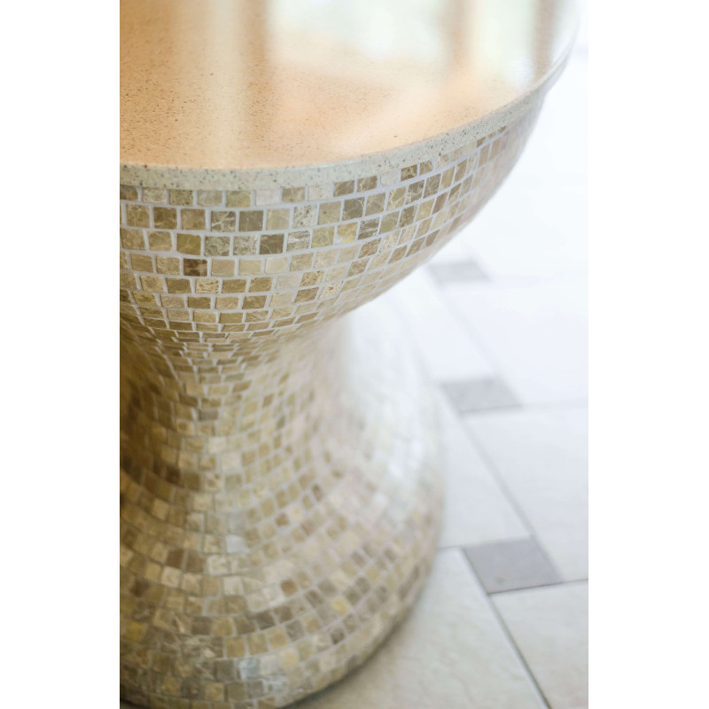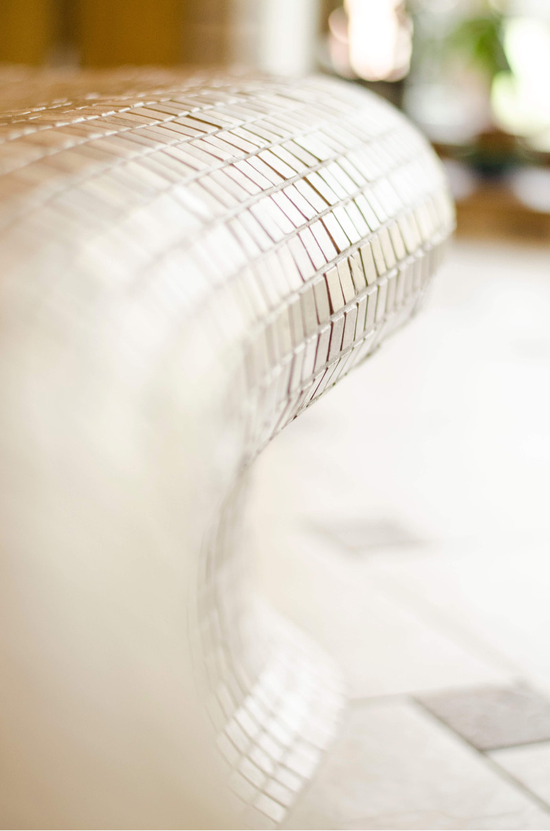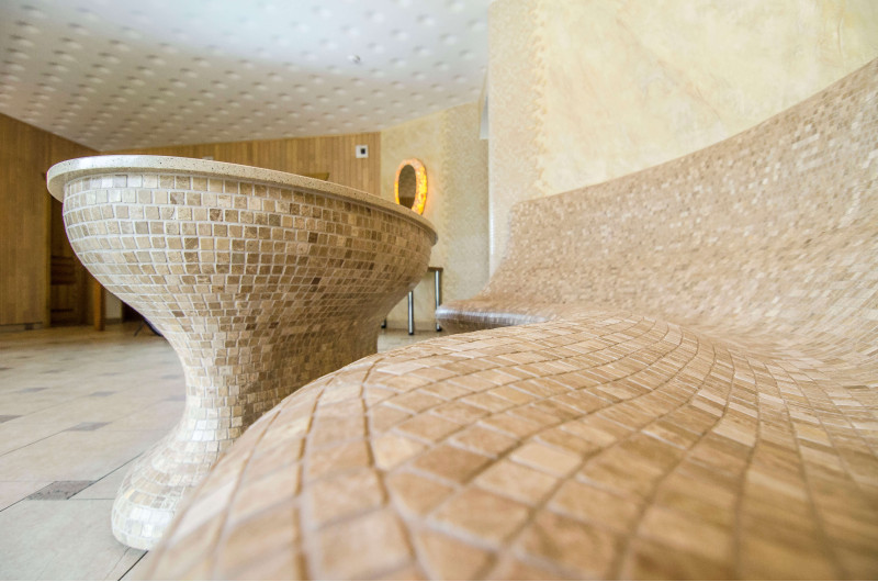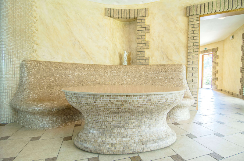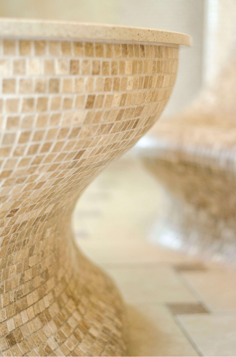 Heated bench and table shapes are made individually from special extruded polystyrene. Countertop - marble. Finish - mosaic tiles. The bench is heated from the heating system.