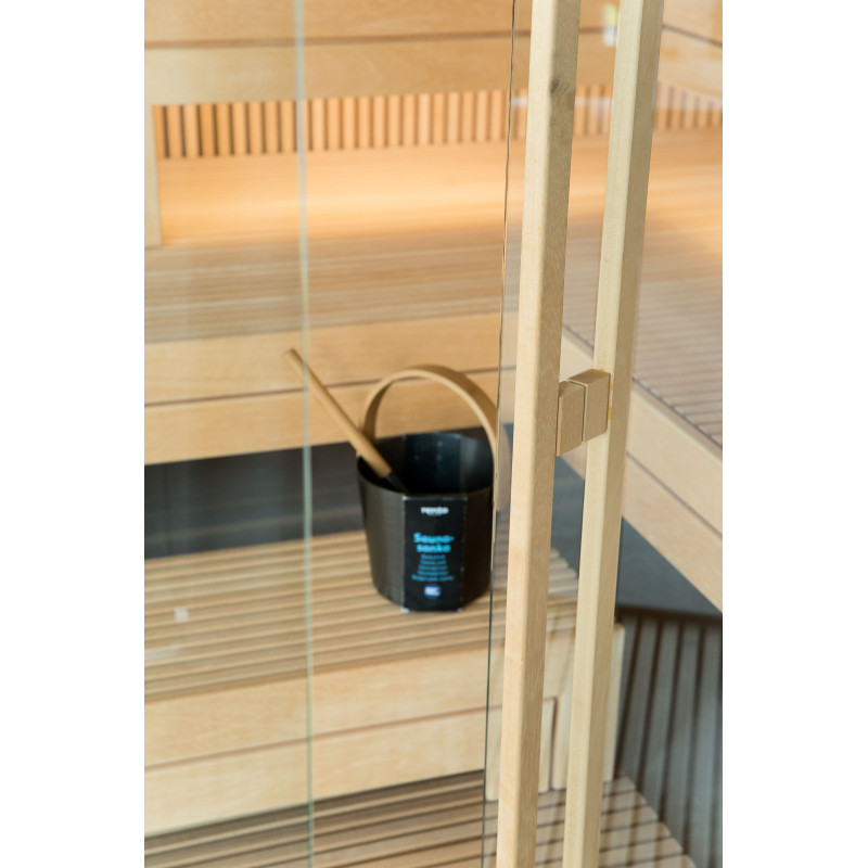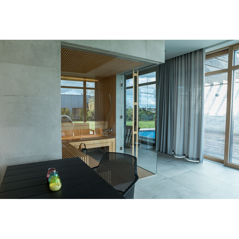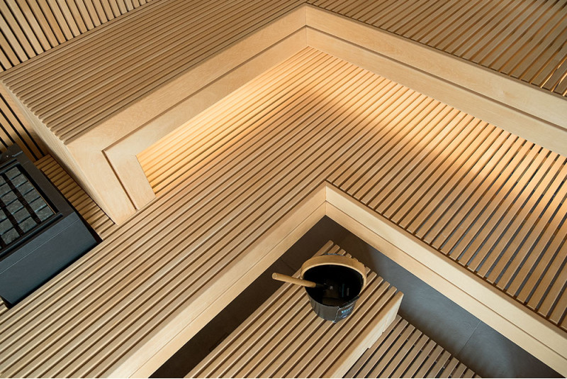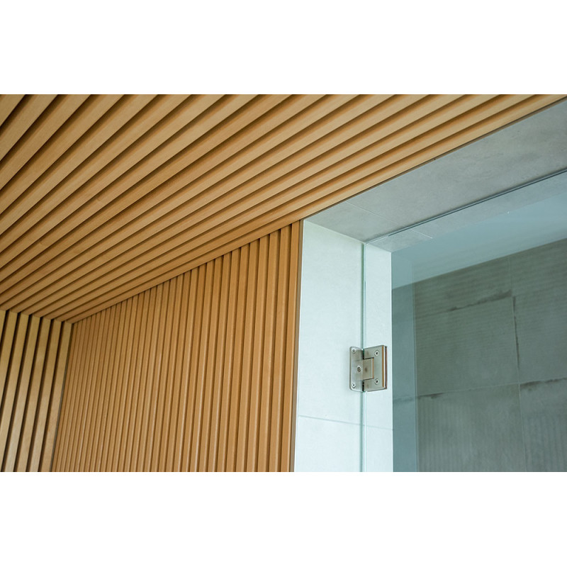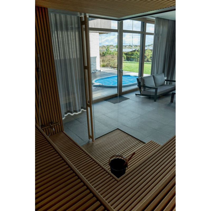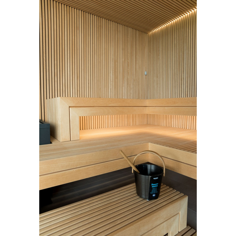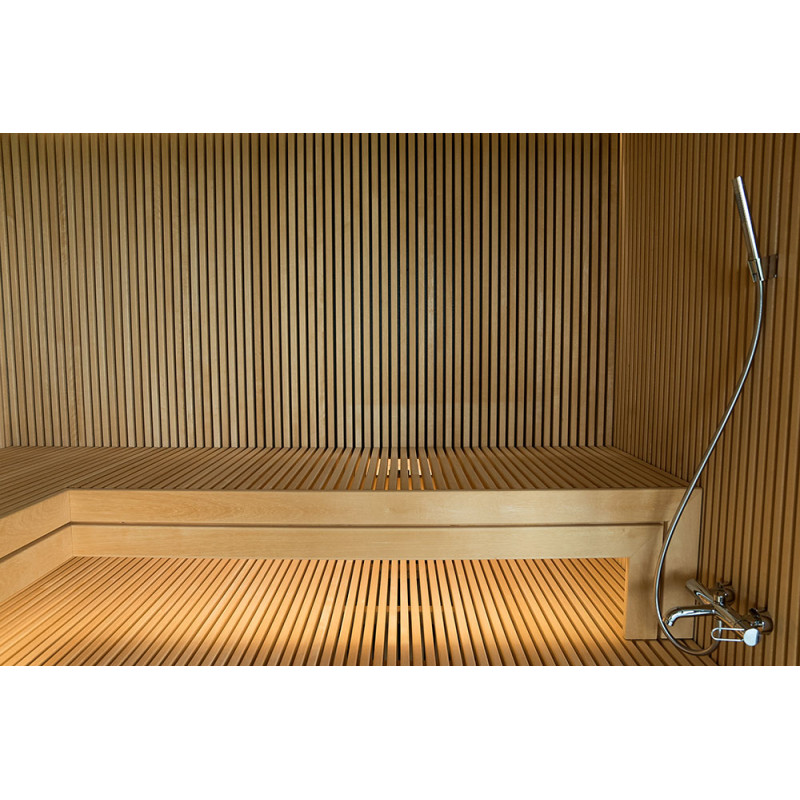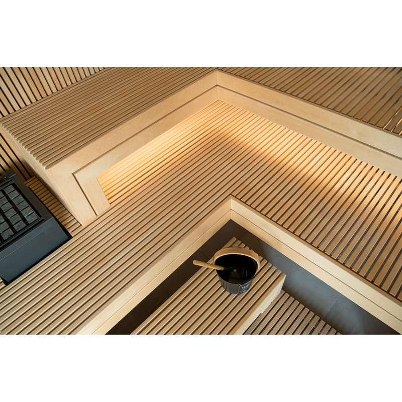 The very light wood chosen is abachi. Soft and low heat. This positive feature allows you to enjoy the pleasures of the sauna in comfort. Fiber optic lighting emphasizes the structure of the wood. The lighting equipped under the loungers and the ceiling winds horizontally across the entire wall and comfortably illuminates the openwork wood strips.