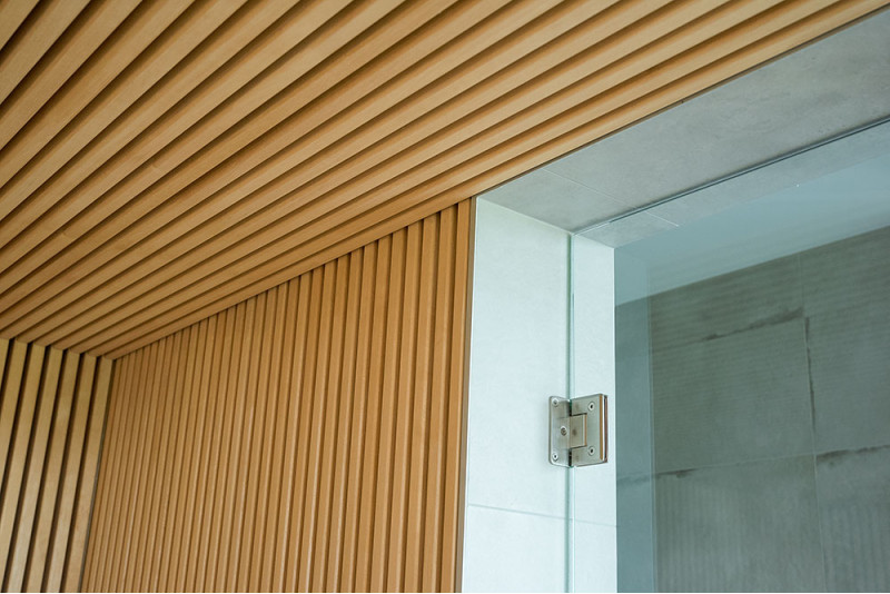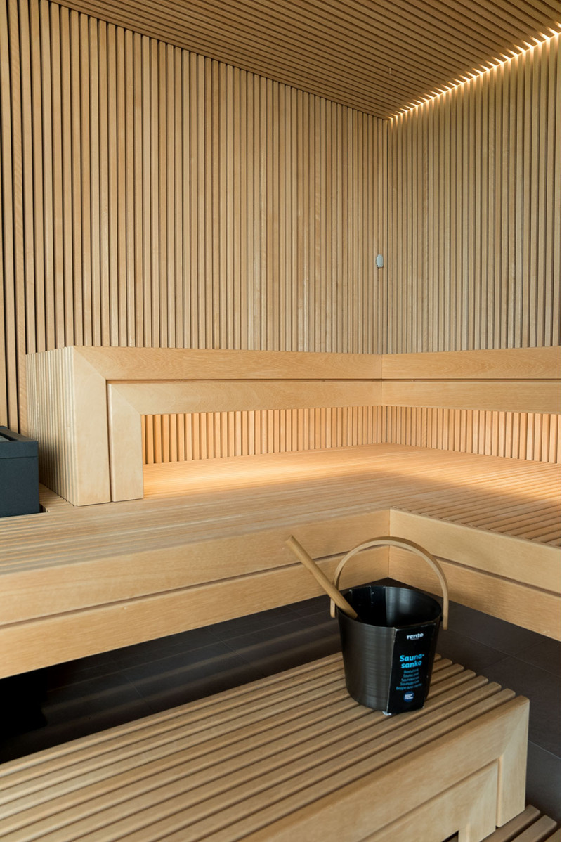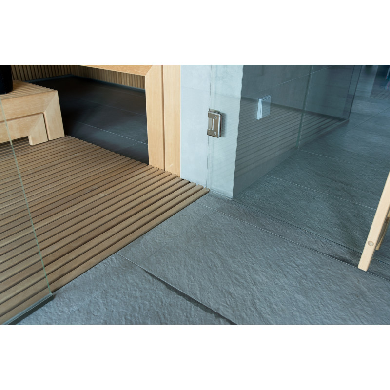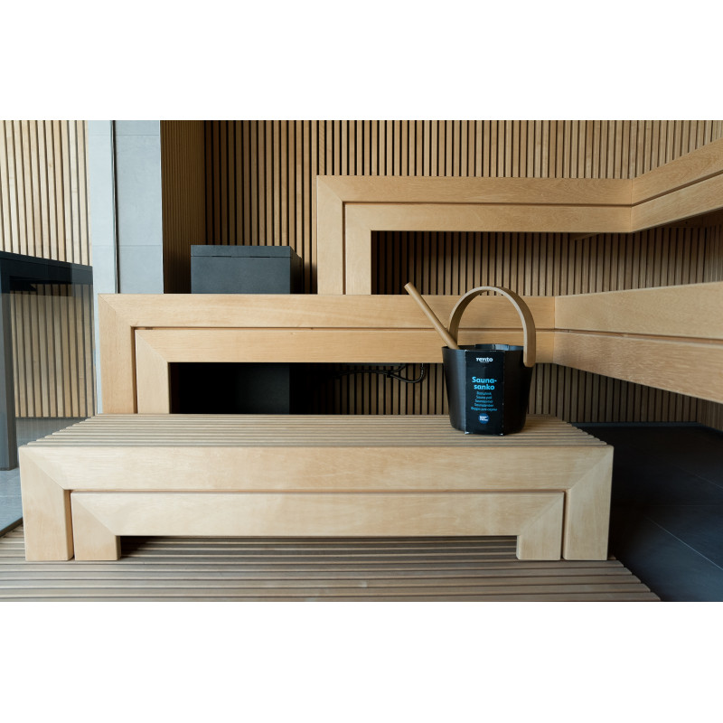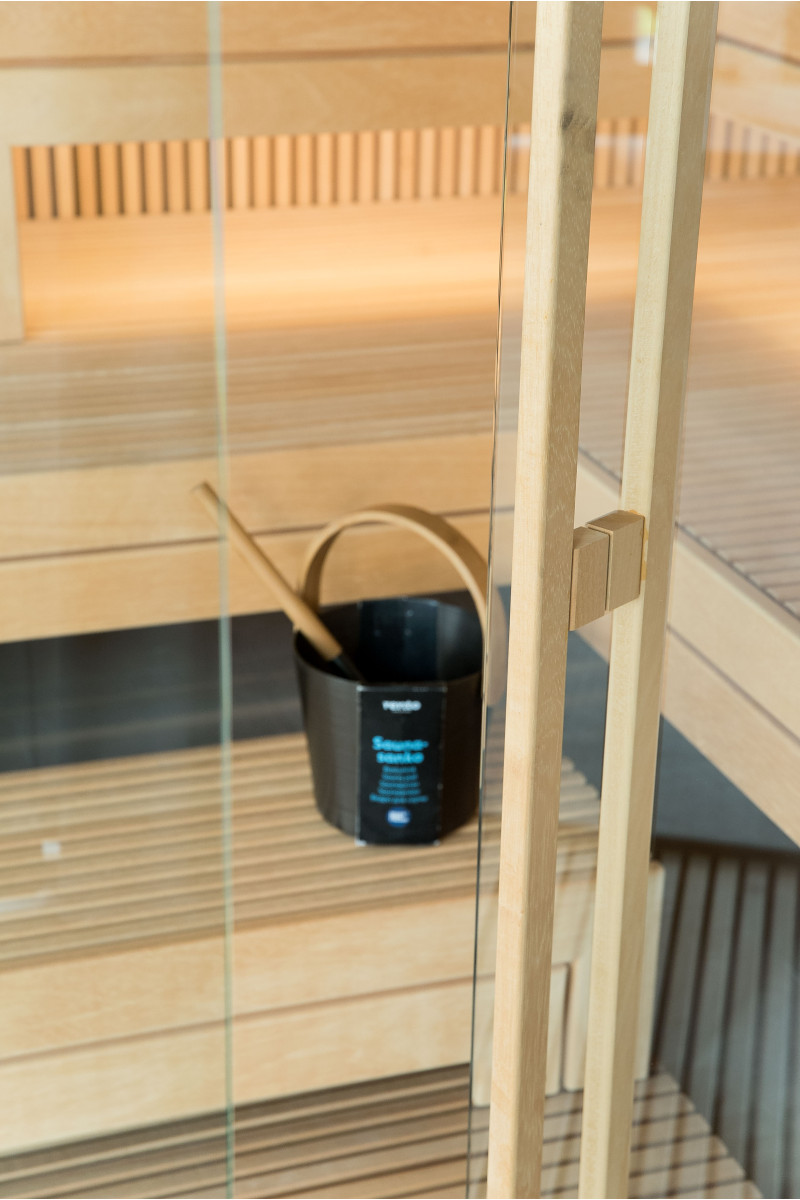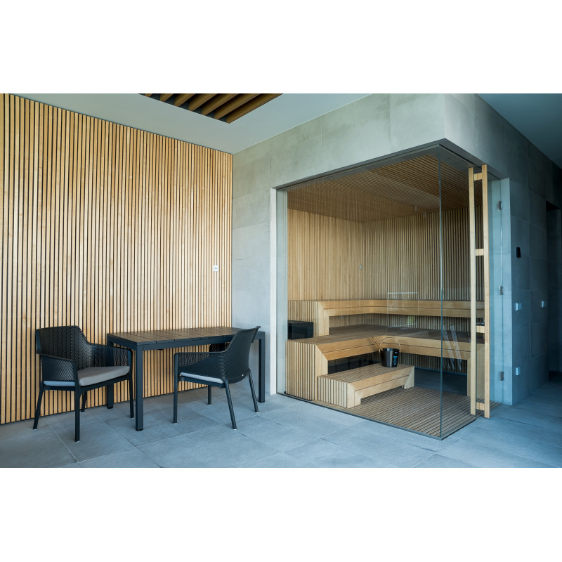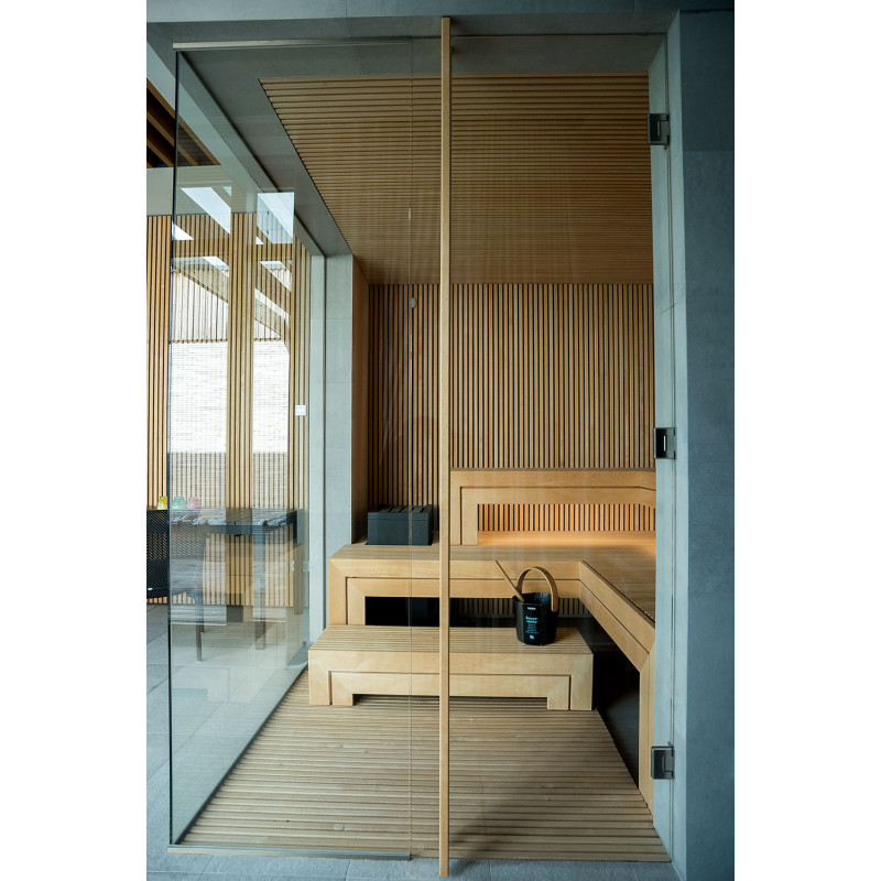 The very light wood chosen is abachi. Soft and low heat. This positive feature allows you to enjoy the pleasures of the sauna in comfort. Fiber optic lighting emphasizes the structure of the wood. The lighting equipped under the loungers and the ceiling winds horizontally across the entire wall and comfortably illuminates the openwork wood strips.