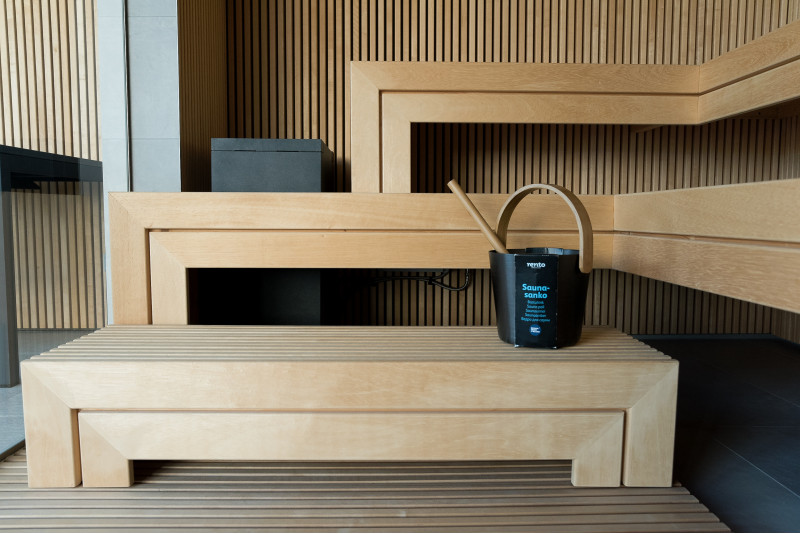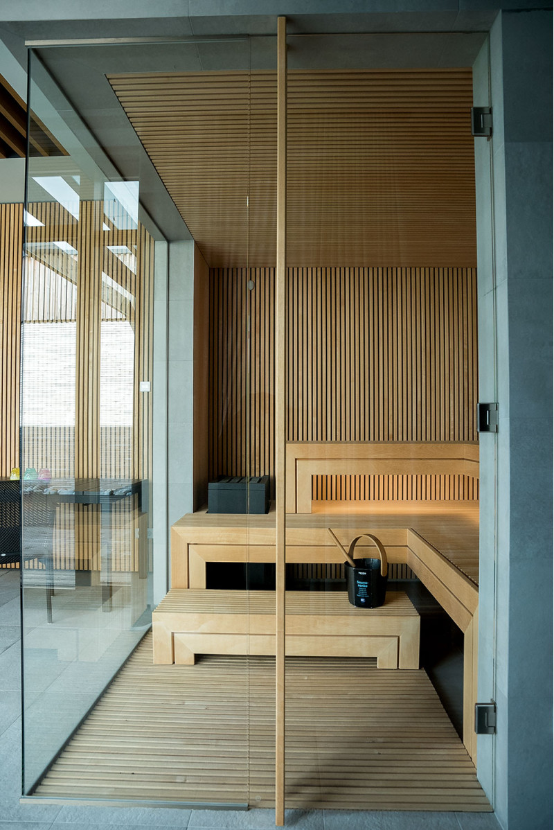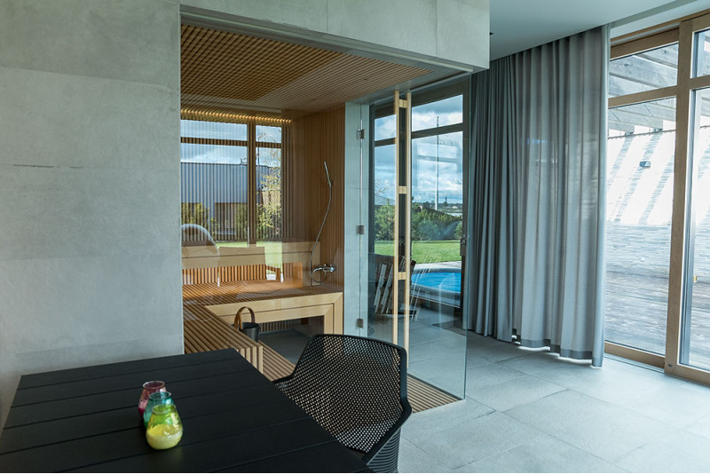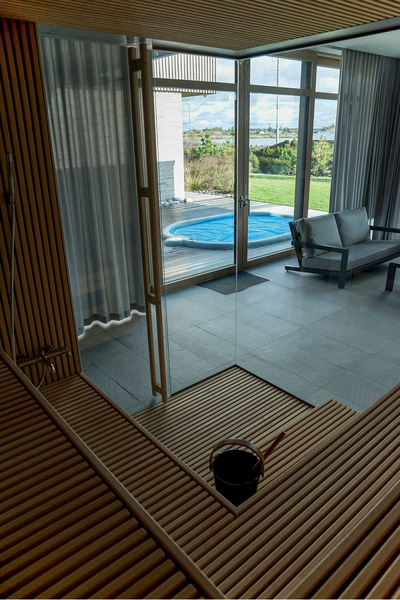 The exclusive design of this sauna is created by decorating with openwork wooden brussels. Repetitive wood motifs were also used in the sauna. A clean and harmonious space has been created, it is not divided by a sauna glass showcase, but on the contrary - it expands and opens the view to the wonderful nature.