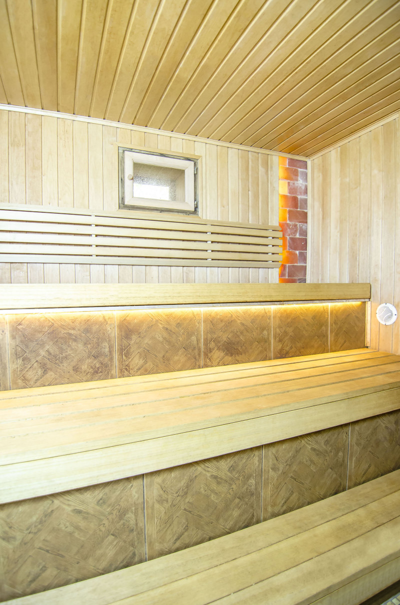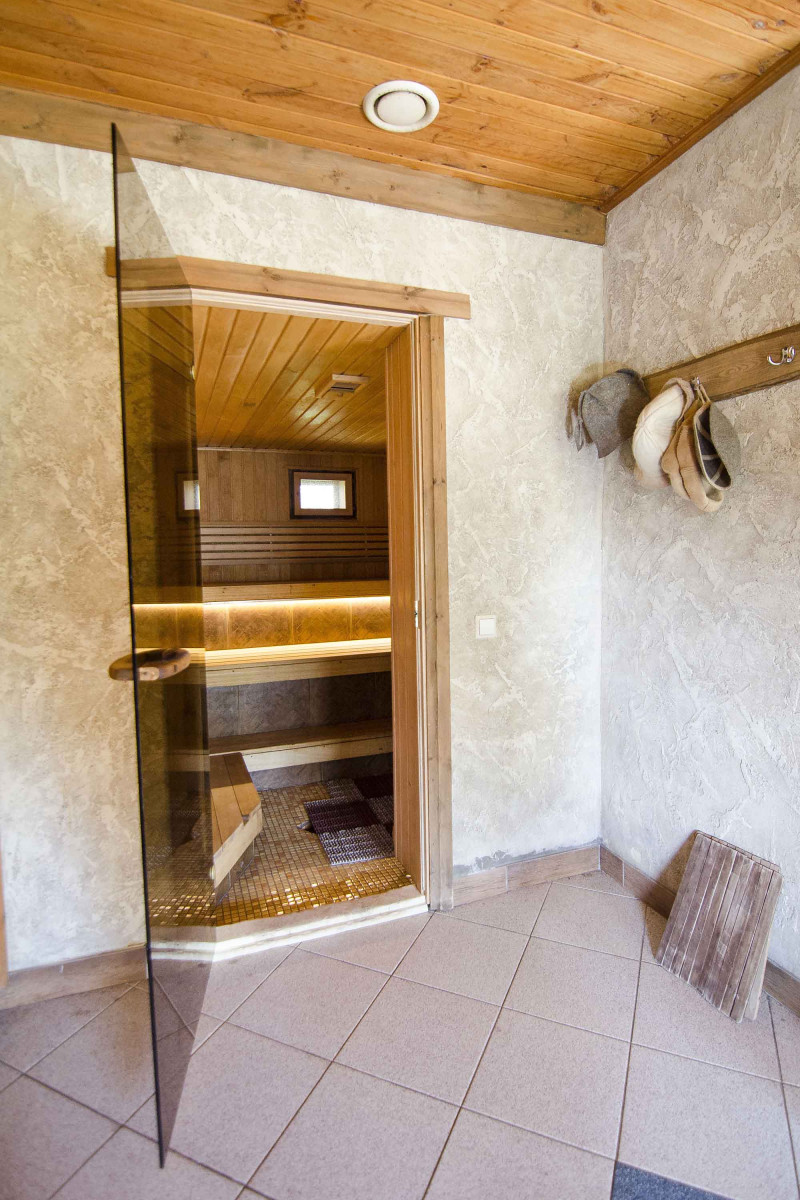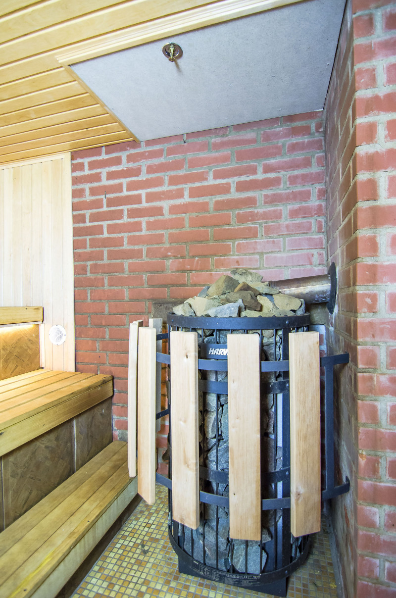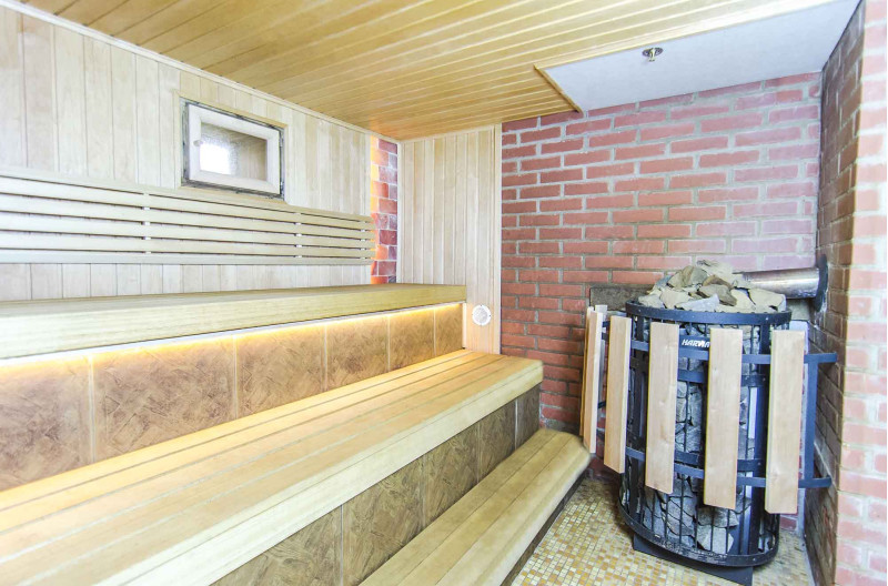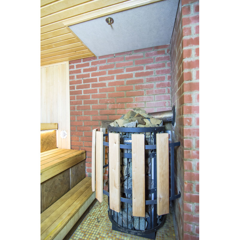 Sauna heating equipment was changed. The handmade heater has been transformed into a wood-burning Harvia Legend 300 Duo with an external firebox that holds a large amount of stones, allowing you to enjoy the heat they radiate even in the absence of high temperatures. The ceiling is equipped with a fire protection system - plate Minerit Sauna, sprinkler. A protective edging of wood and metal is installed around the heater.