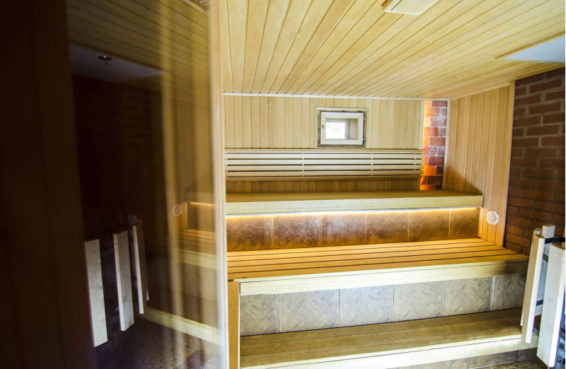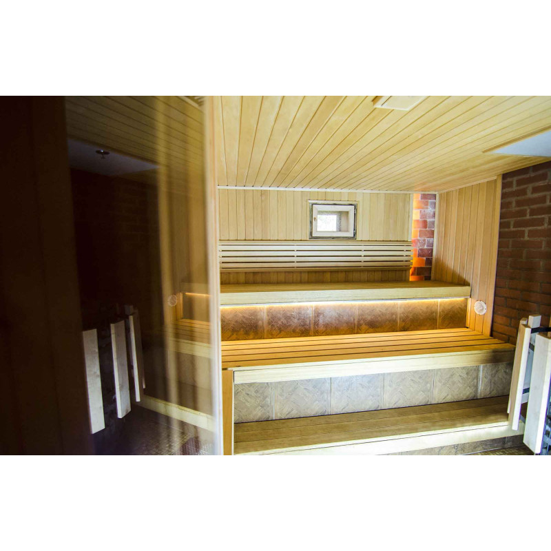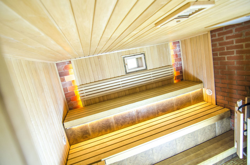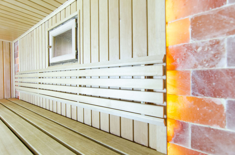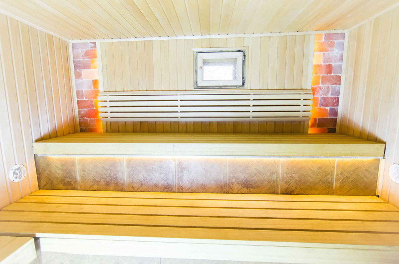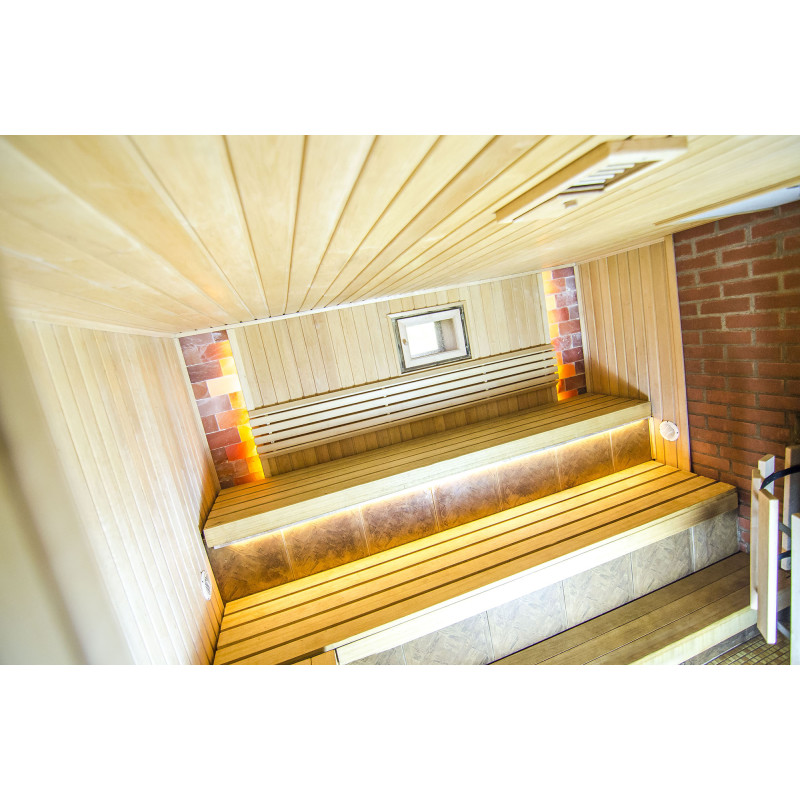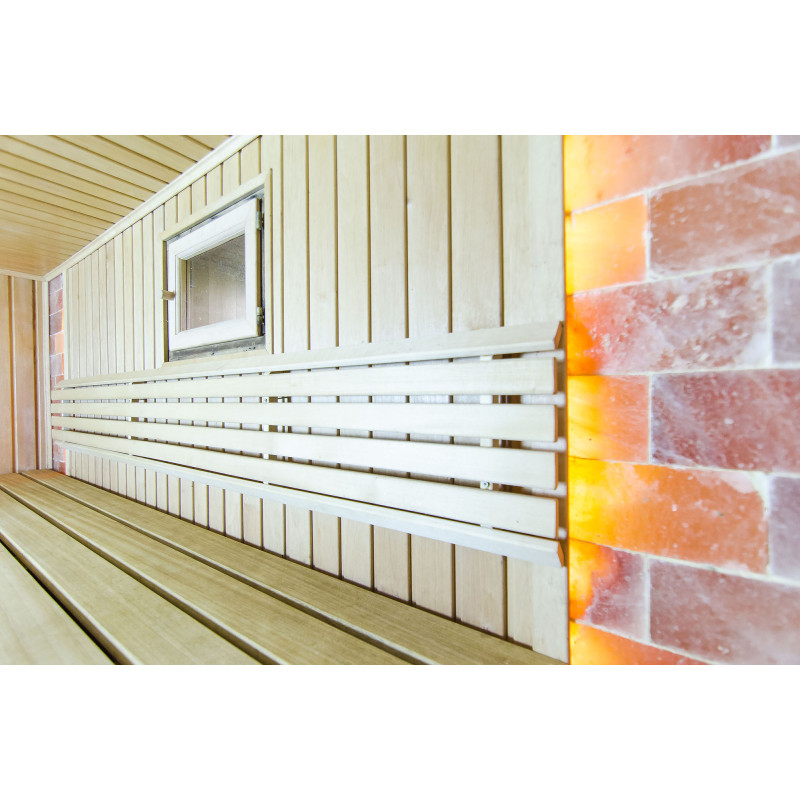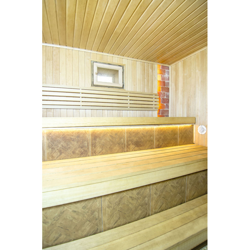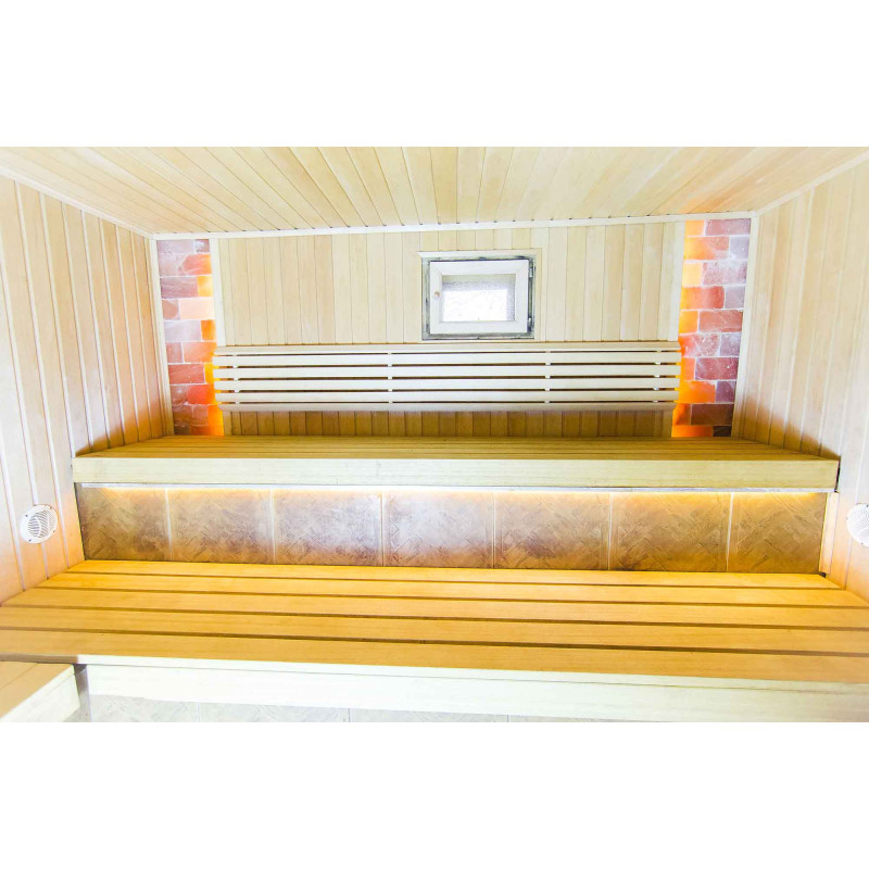 An excellent decorative element was chosen for the decoration of the sauna - Himalayan salt blocks. Himalayan salt not only looks great, but also improves indoor air quality, reduces the symptoms of allergies and asthma, elevates mood and provides energy, neutralizes electromagnetic radiation, reduces static electricity in the air. The built-in LED lighting behind the salt blocks creates an even more cozy environment in the sauna and accentuates the look of the Himalayan salt blocks.