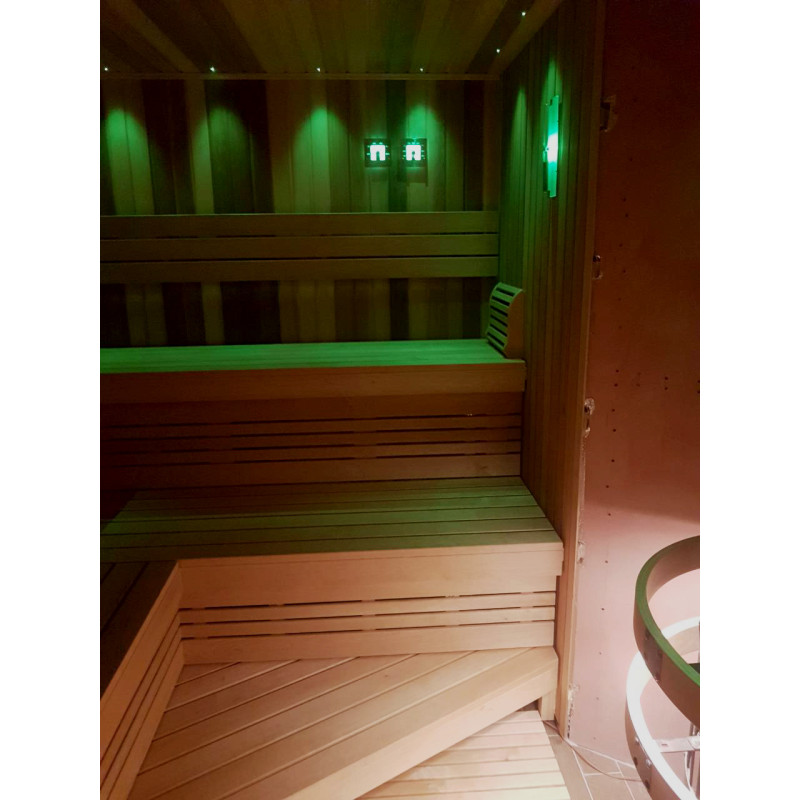 For stylish sauna lighting: Cariitti fiber optic lighting projector, lamps under the backrests and benches and illuminated thermometers. Luminaires can change colors - depending on your wishes and mood.