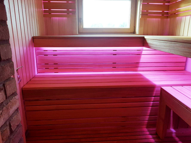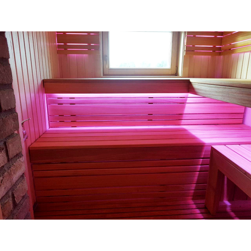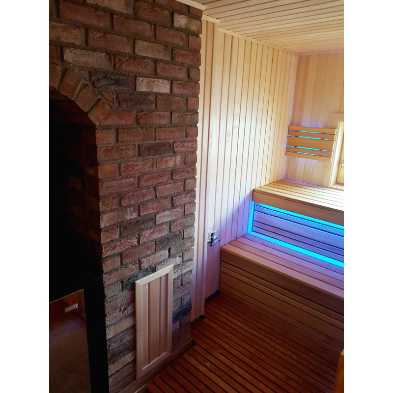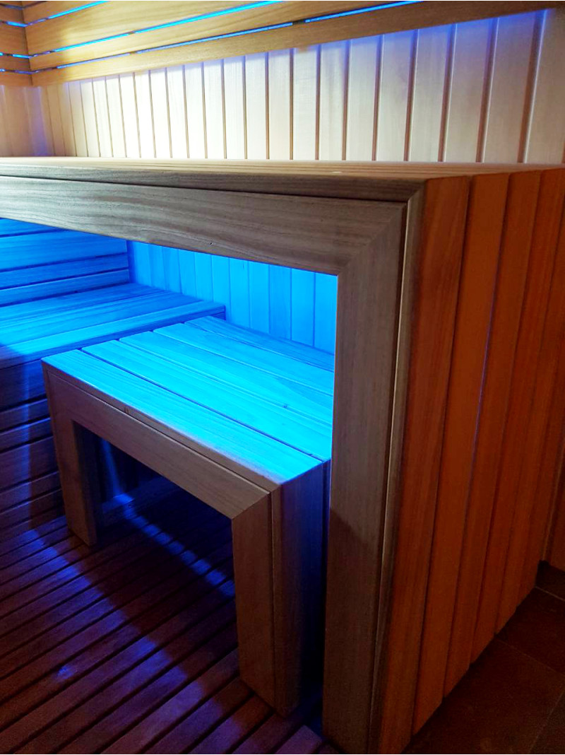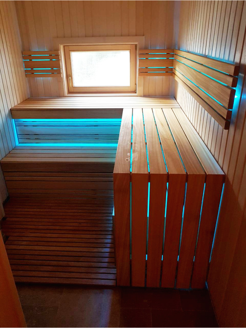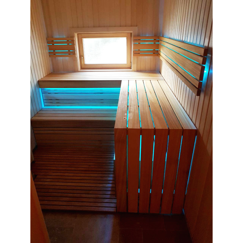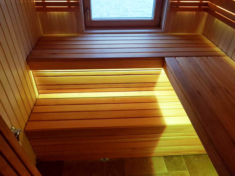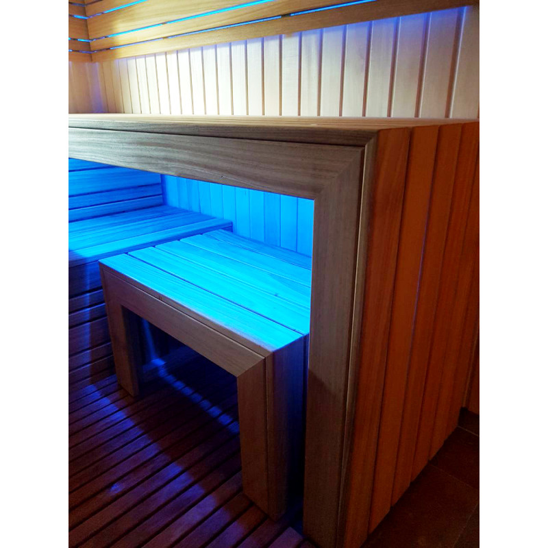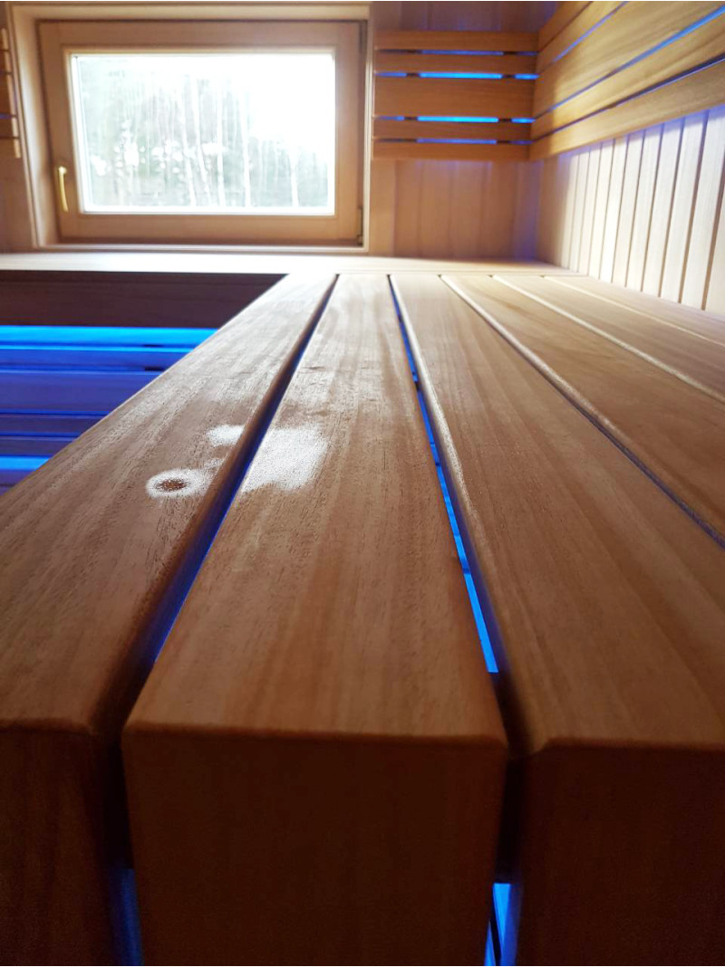 The interior wooden details and benches of the sauna are African abachi wood. Due to its structure, this wood is soft and very low in heat, which makes it very suitable for installing sauna benches.