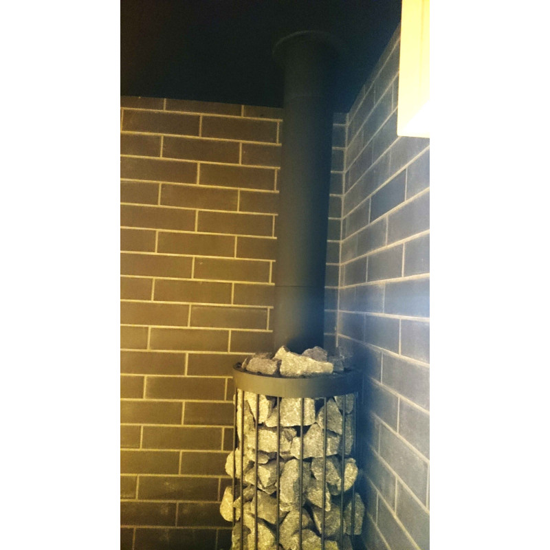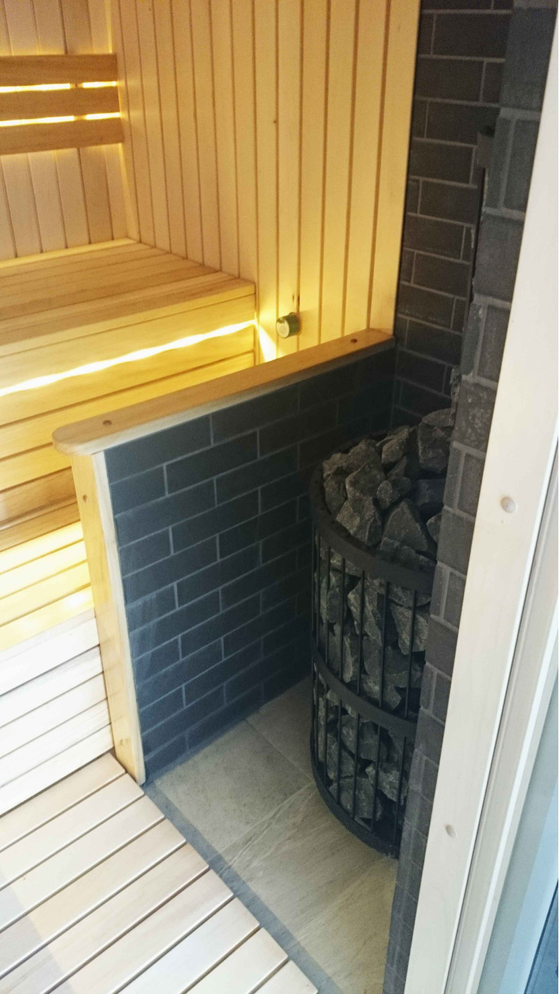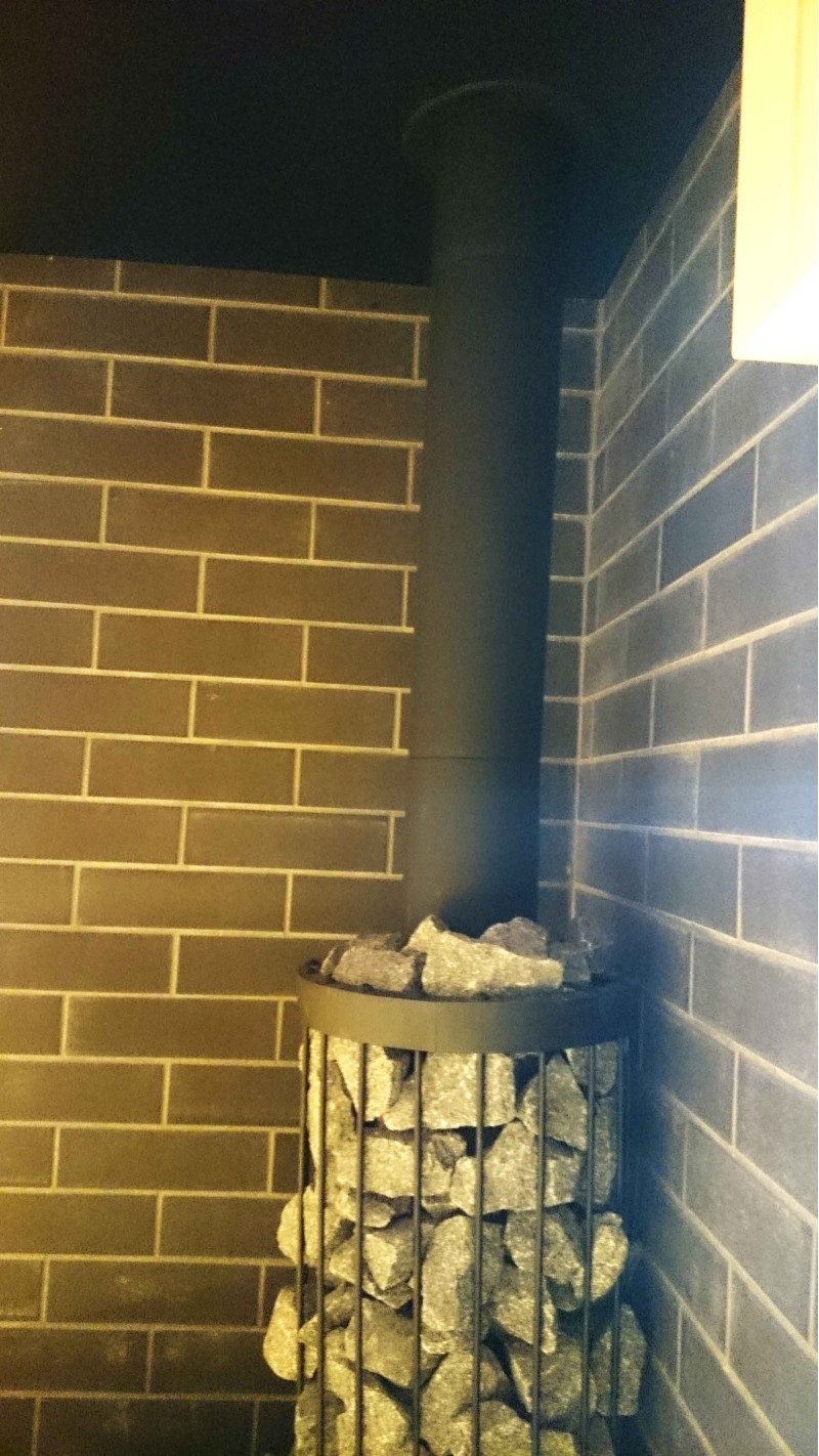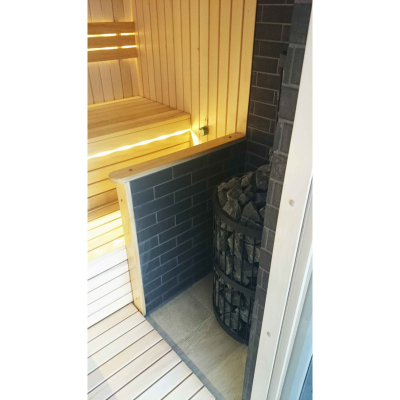 This sauna project with a protective wall for the heater. The wall is made out of a Minerit heat-resistant plate, on a metal frame.