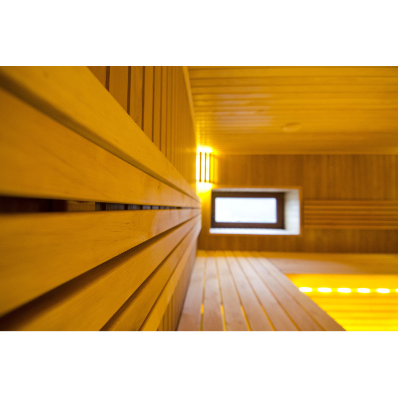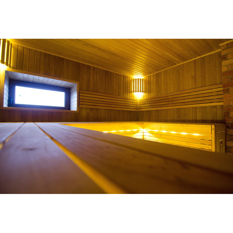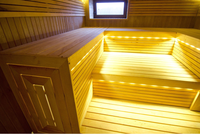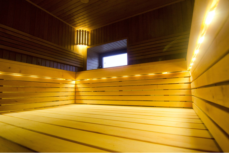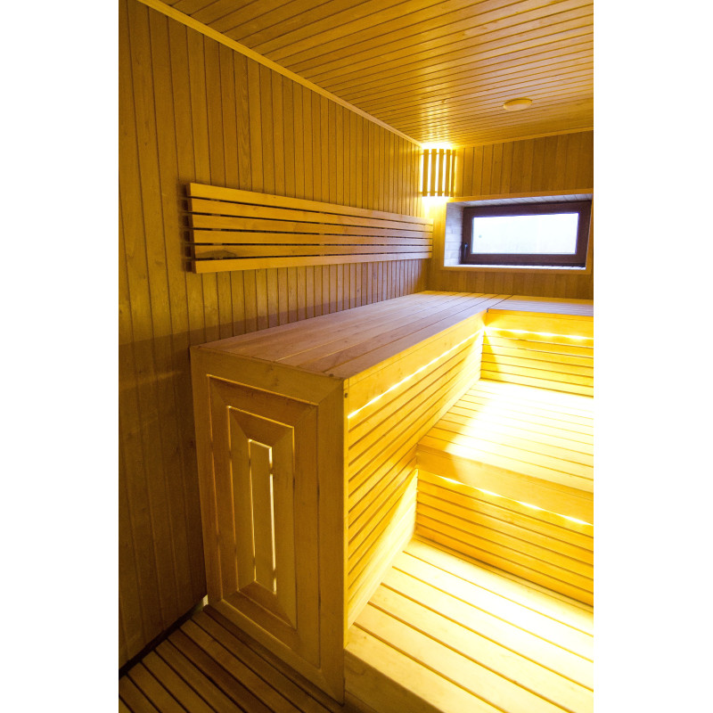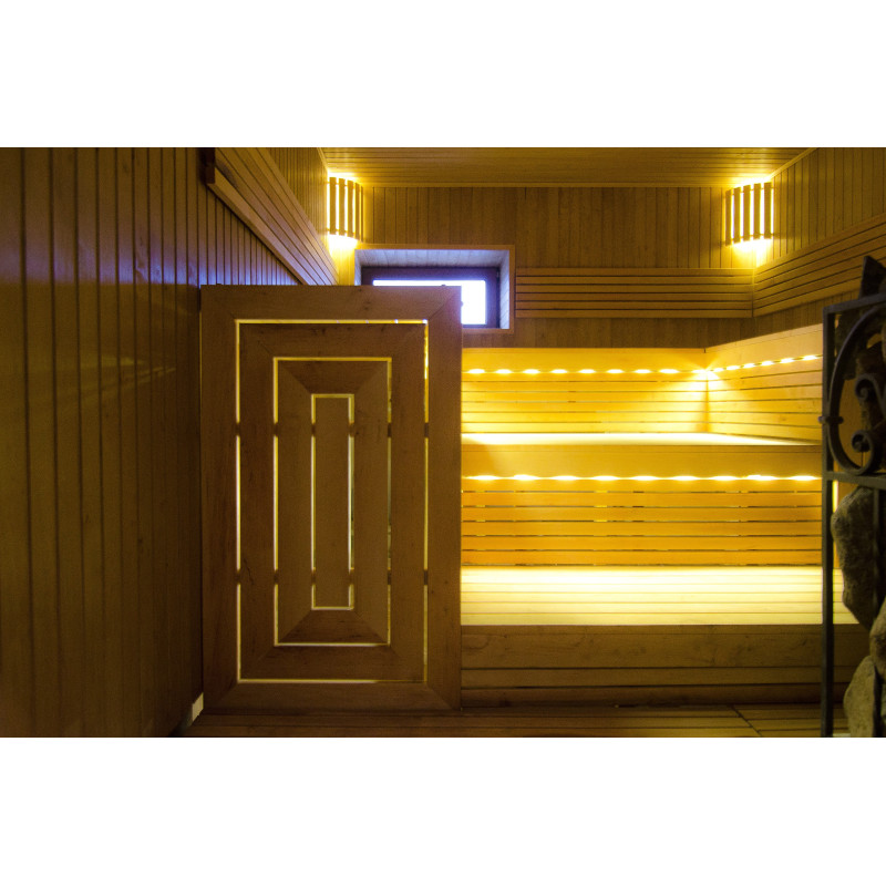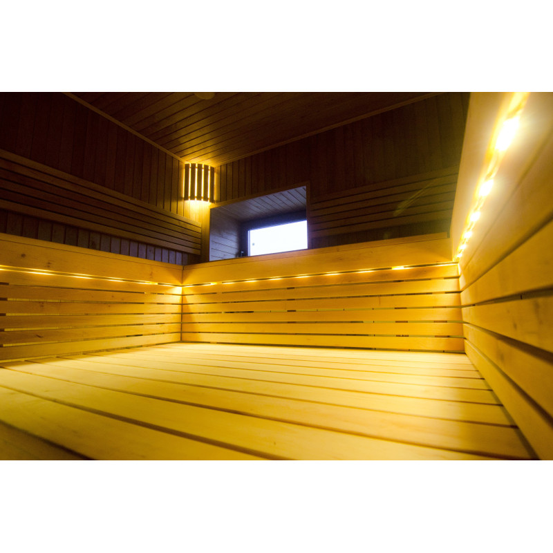 The sauna is equipped with warm-colored LED lighting under the loungers and wall lamps with wooden covers.
