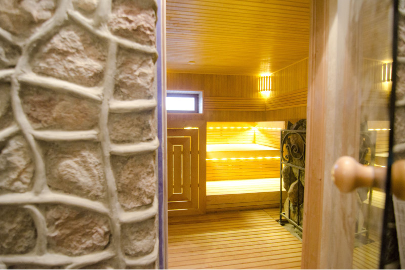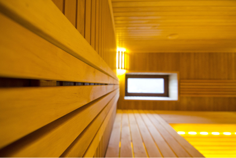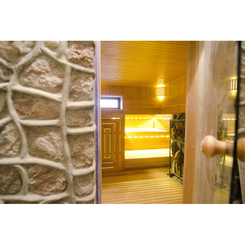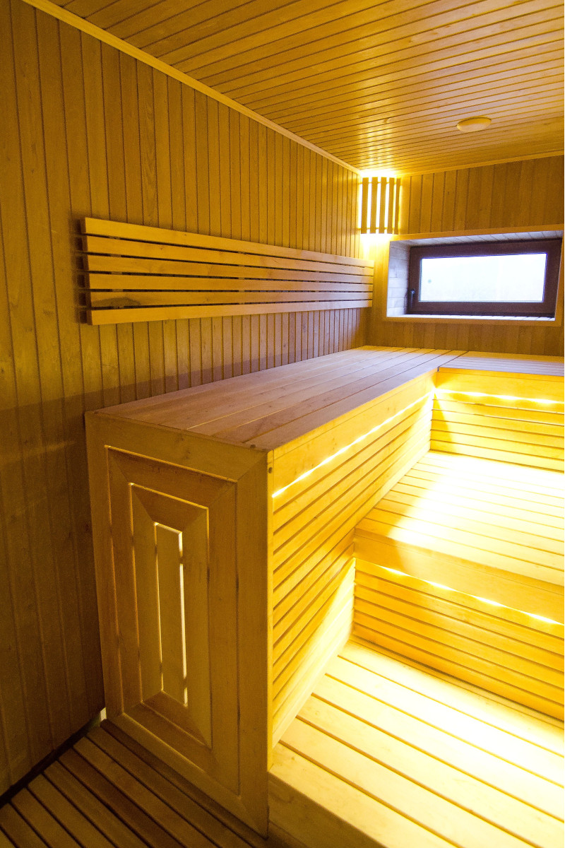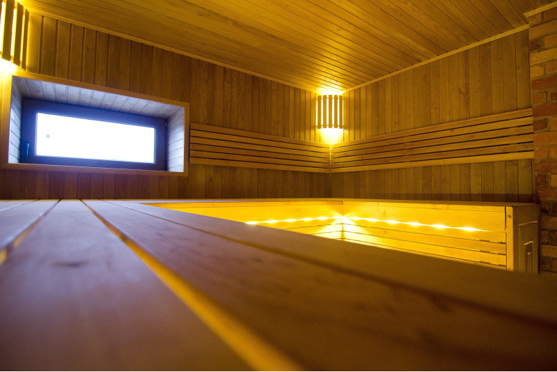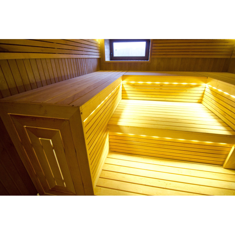 The sauna is equipped with warm-colored LED lighting under the loungers and wall lamps with wooden covers.