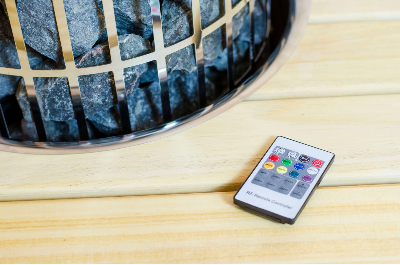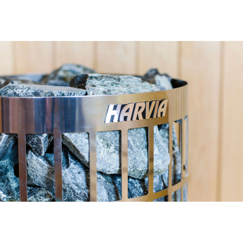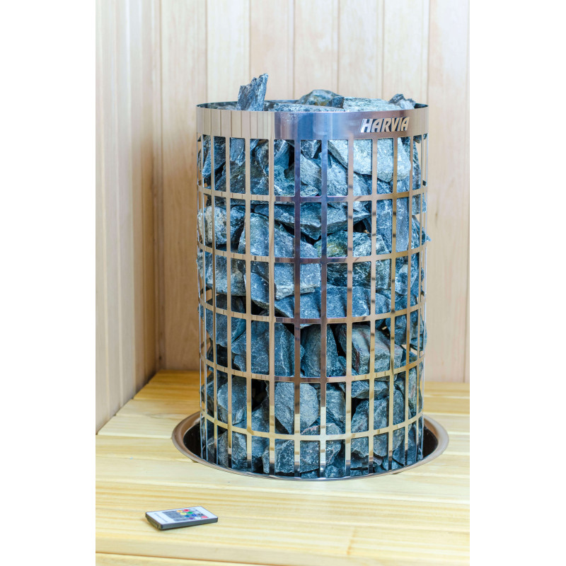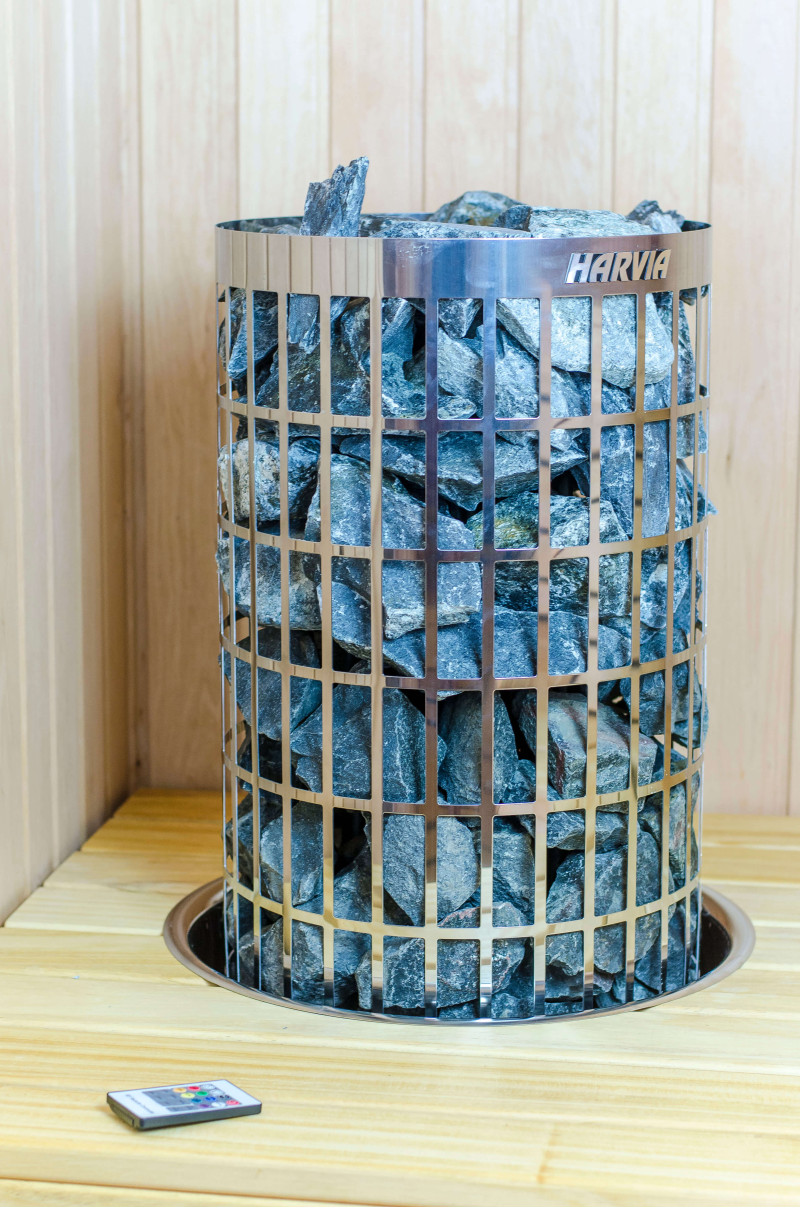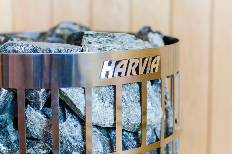 Heater - Harvia Cilindro with a finishing ring and filled with gabbro diabase stones. Doors - tempered bronze glass with a black alder frame.