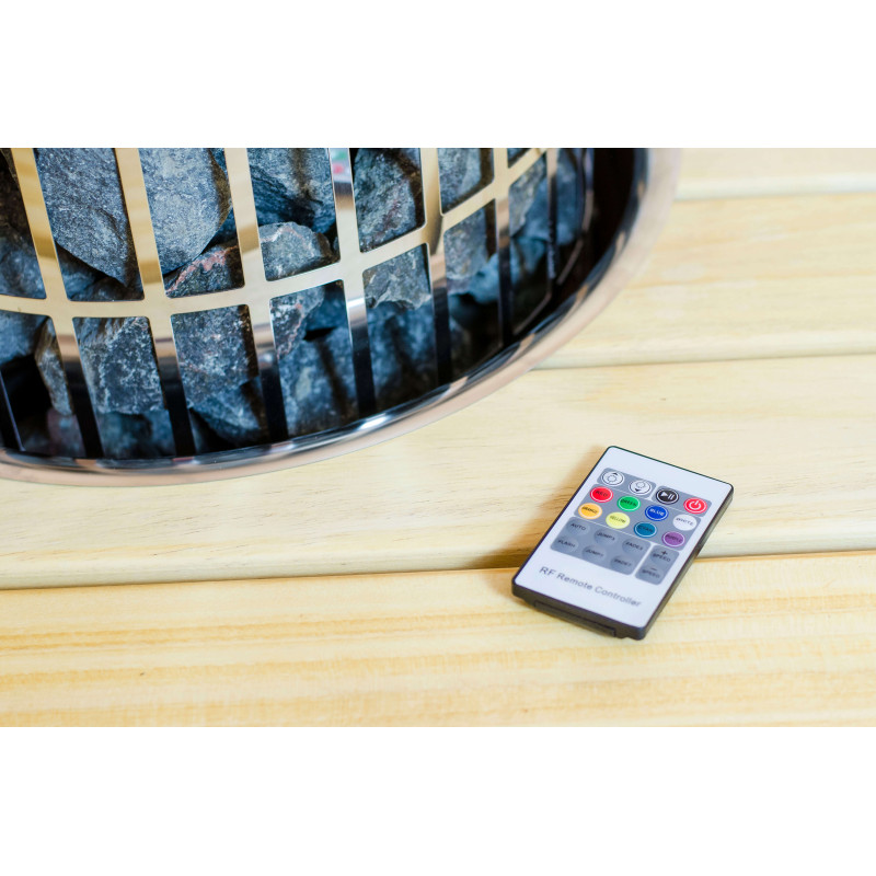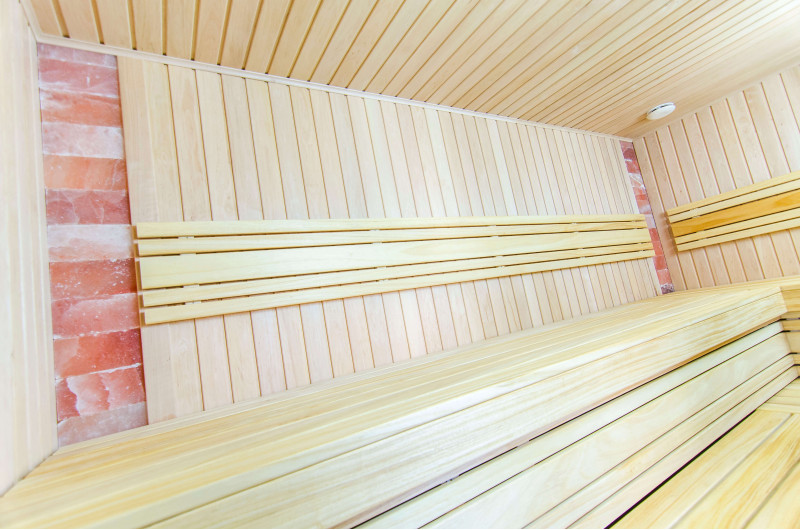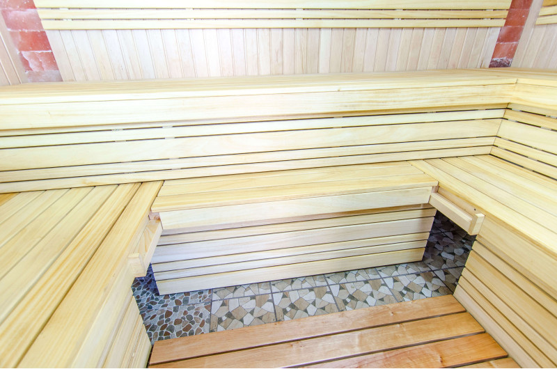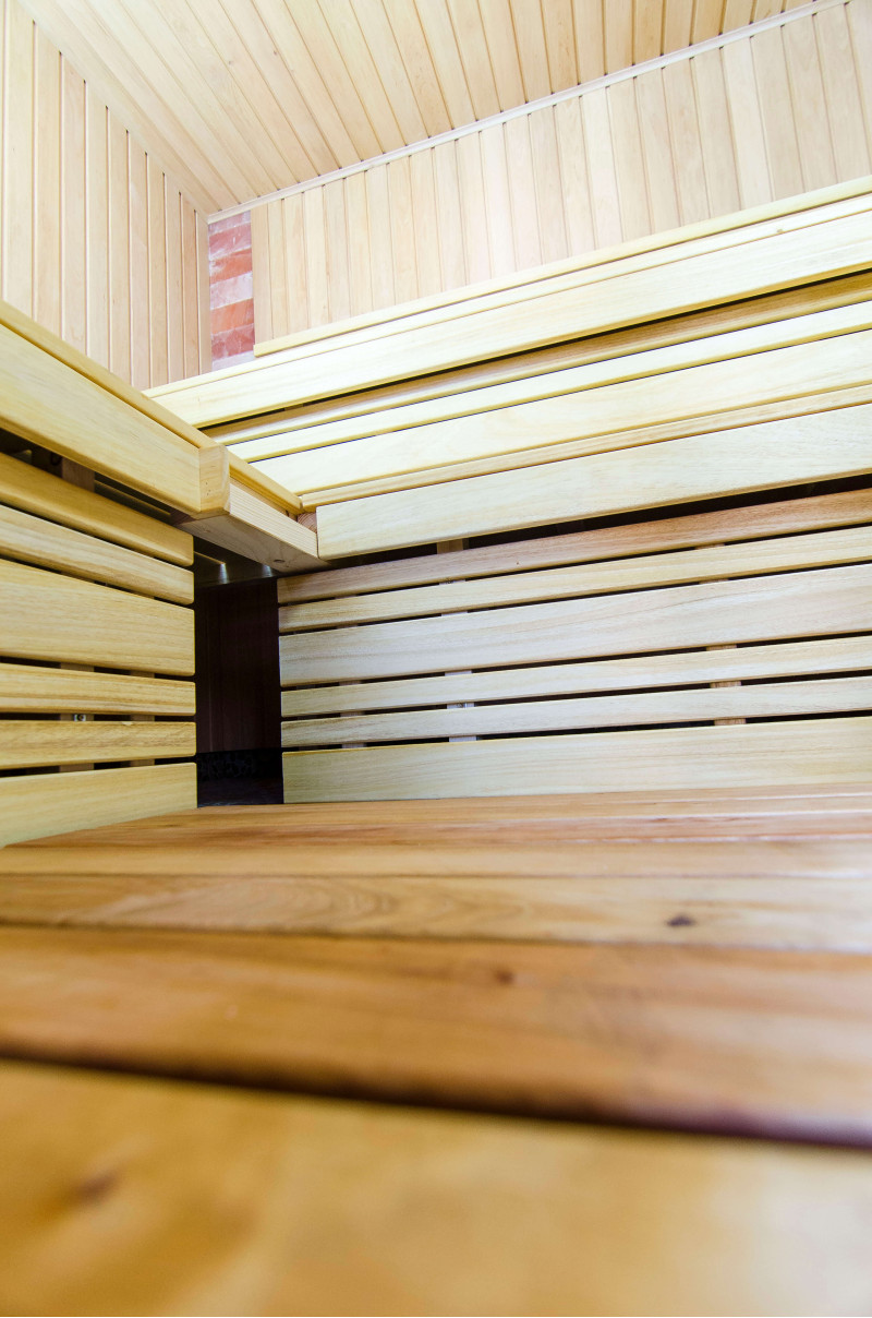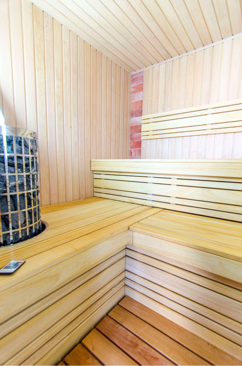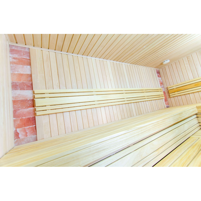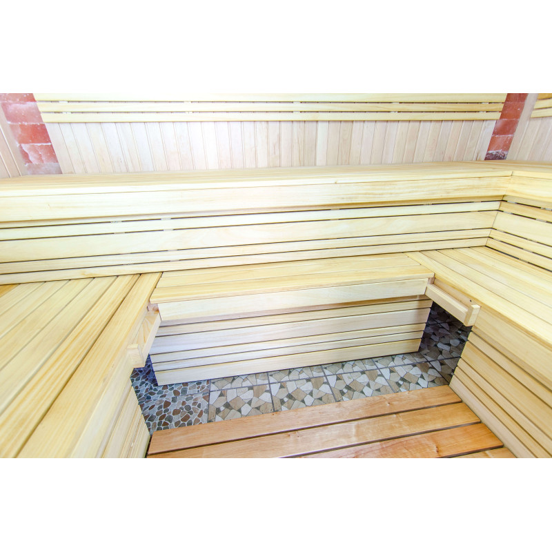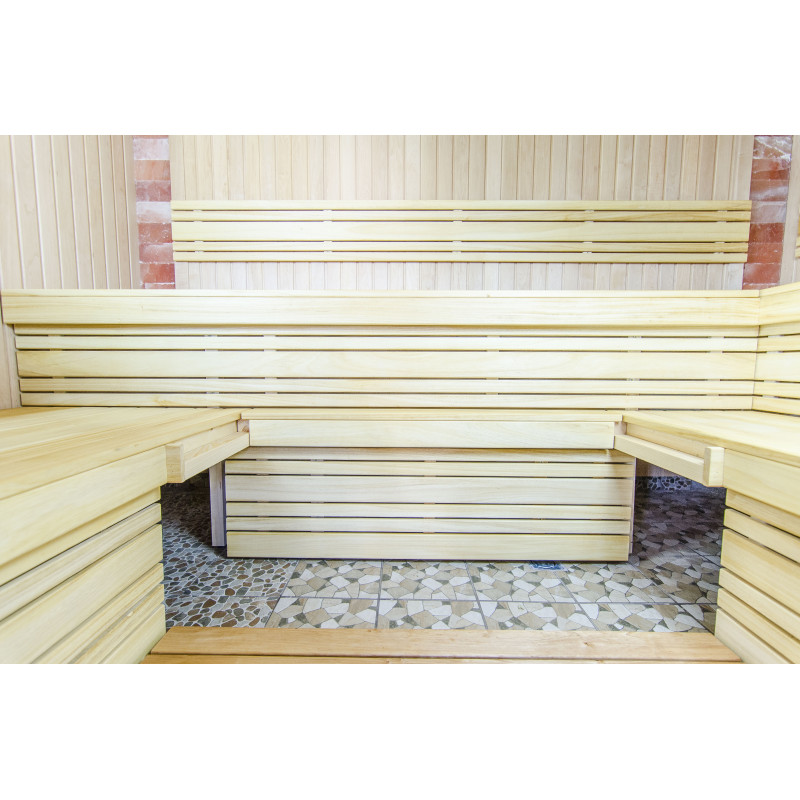 Benches, backrests, ceilings, walls - made of African non-heating high-class abachi wood, floor gratings - of black alder wood. The backrests and behind the Himalayan salt bricks feature built-in color RGB lighting, controlled by a wireless color-changing console that accentuates the distinctive look of the Himalayan salt.