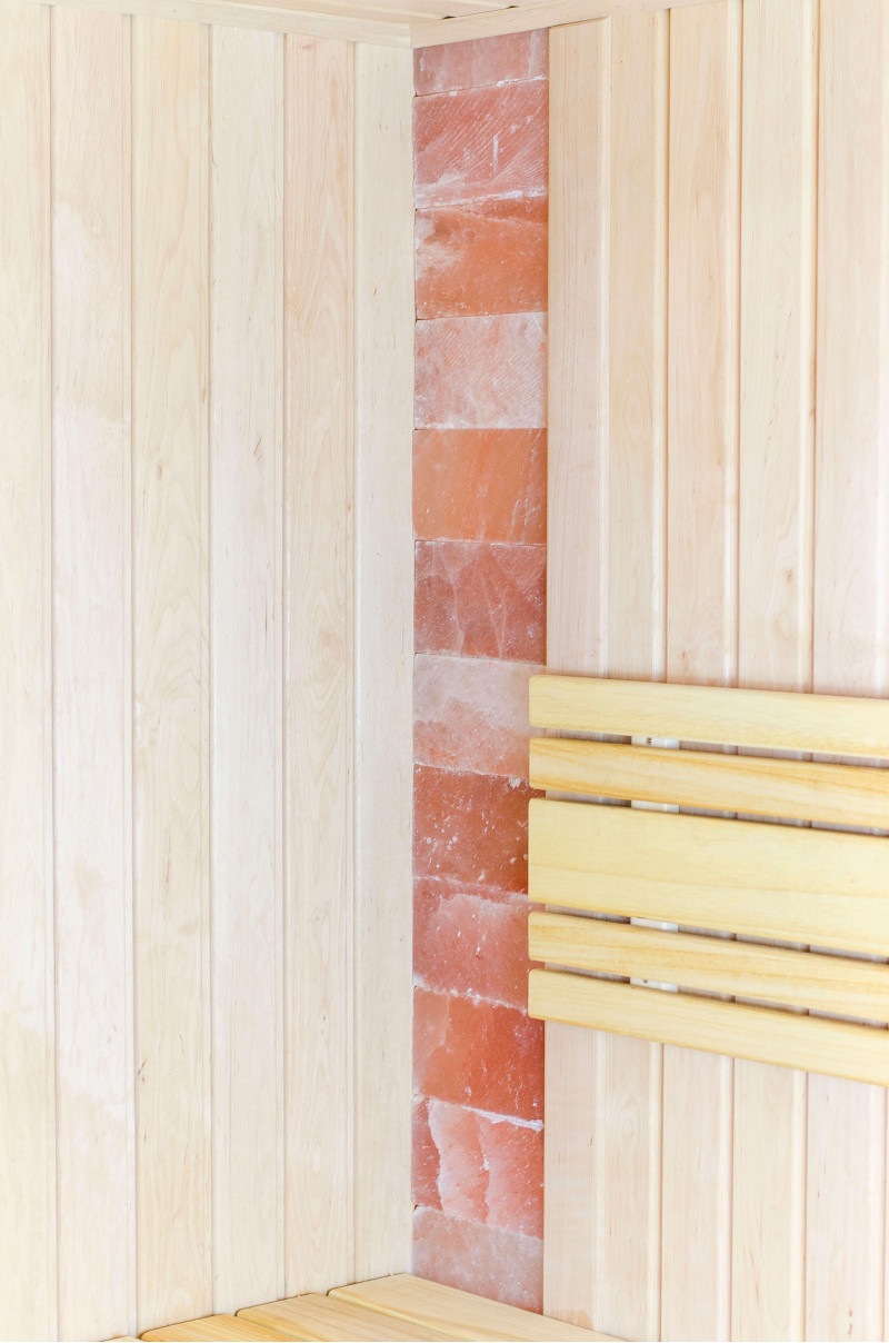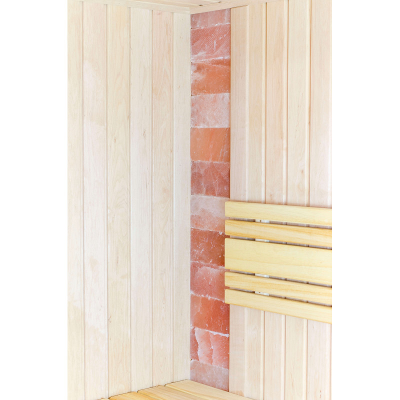 The Himalayan salt bricks selected for the decoration of the sauna with built-in lighting create a cozy environment and further enhance the effect of the sauna. Himalayan salt stones are a natural ionizer that effectively improves air quality by emitting negative ions. Negatively ionized air improves health, helps treat many ailments such as: bronchial asthma, lung and bronchial diseases, postinfarction, hypertension, gastrointestinal ulcers, gastritis, thyroid diseases, dermatitis, various allergies, nervous diseases, helps to overcome stroke . The benefits of doing the procedures in such a sauna will be twofold.