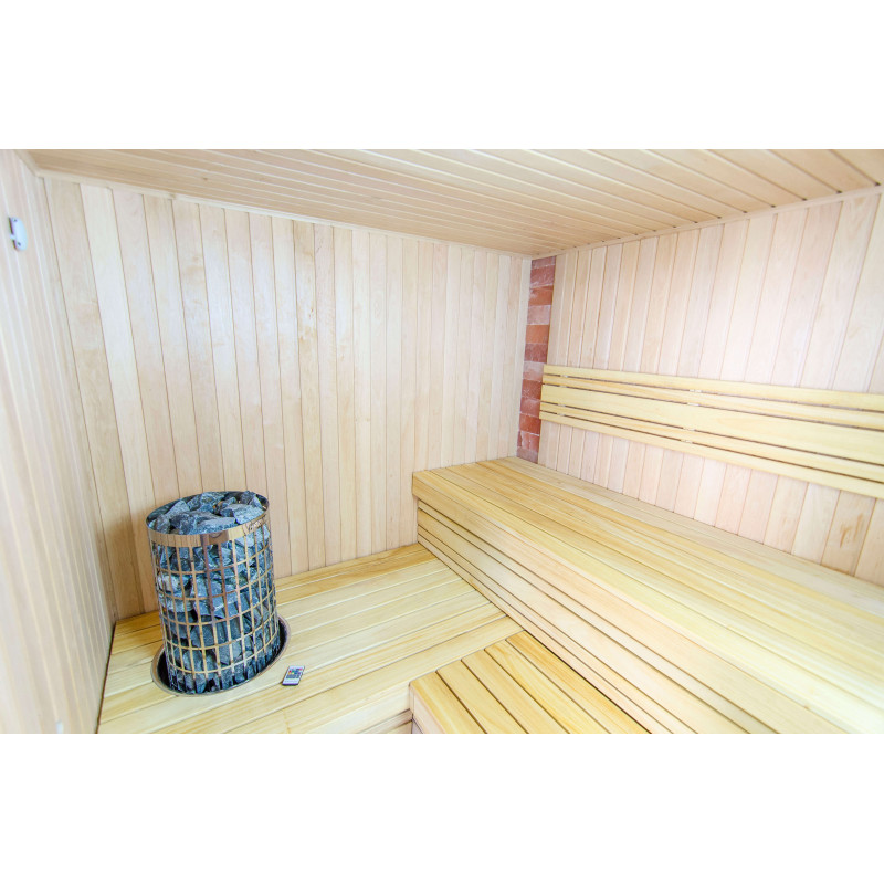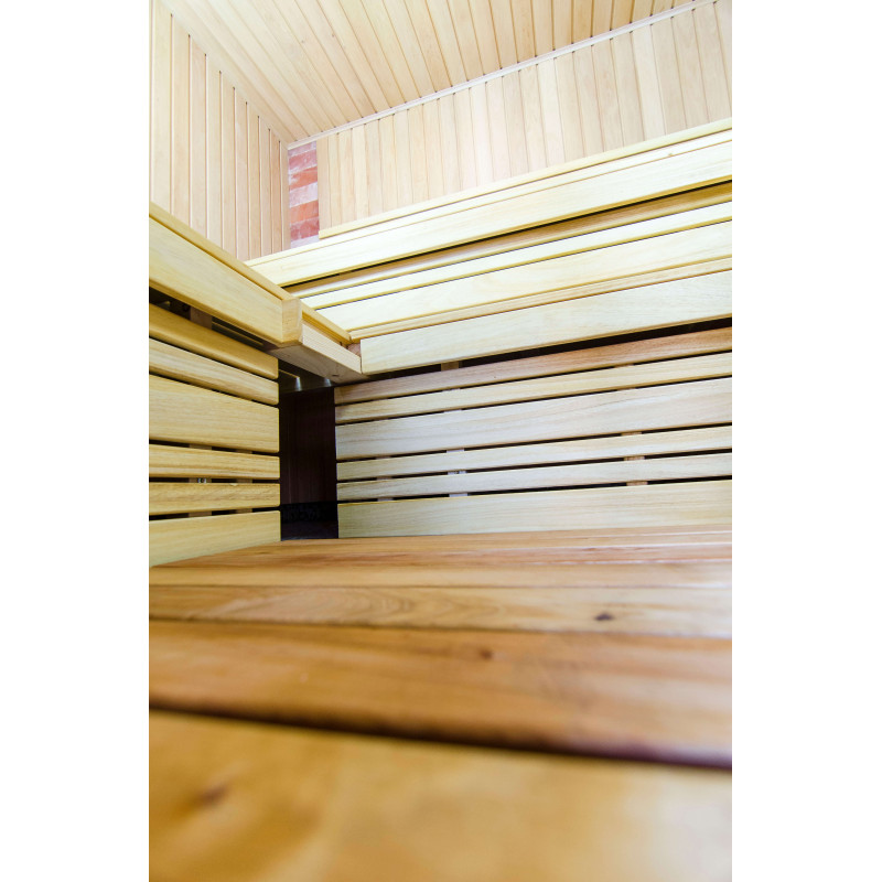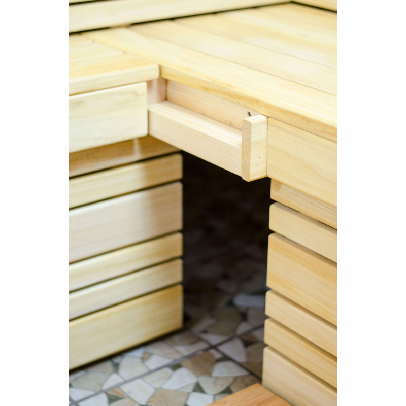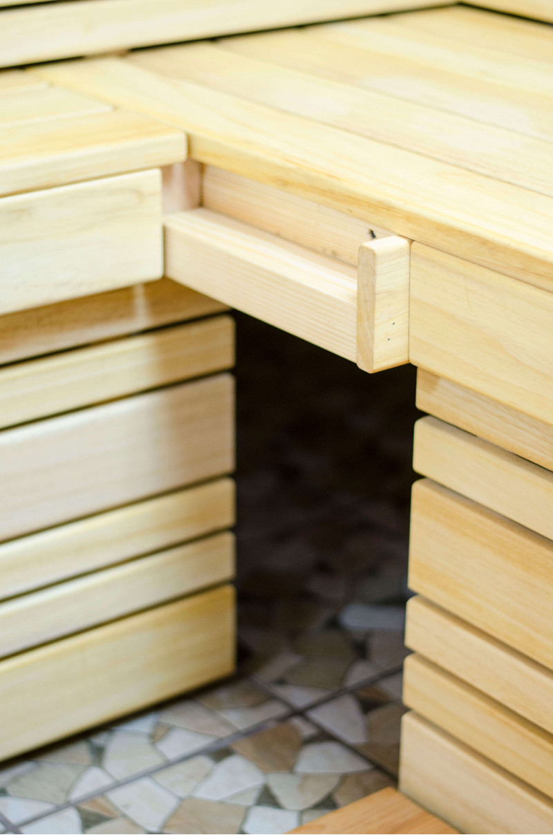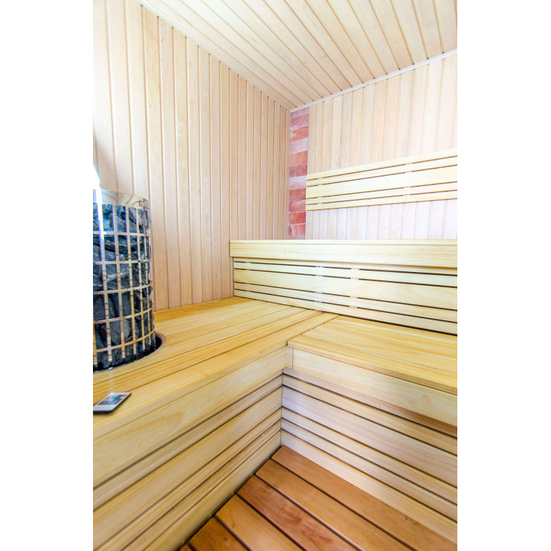 The biggest advantage of this sauna is the sliding lower bed bench for comfortable bathing. At the customer's request, sunbeds that were wide enough and of the right height were designed to stand comfortably. During bathing, the sunbed turns into a seating area. The wide sunbed makes it much more comfortable to bathe yourself, as it is possible to get your feet where it is warmer.