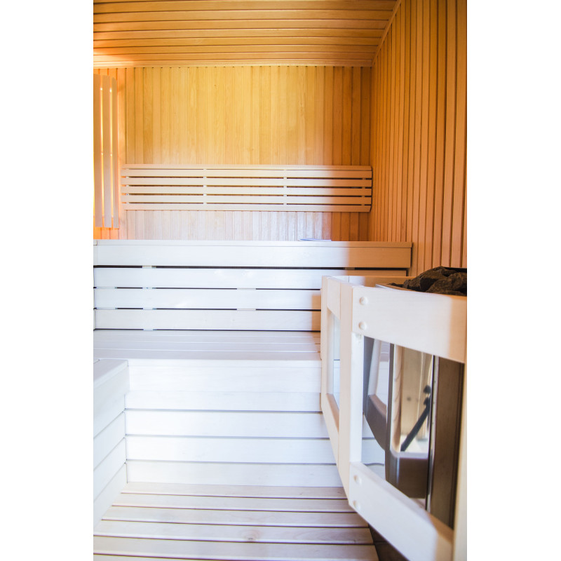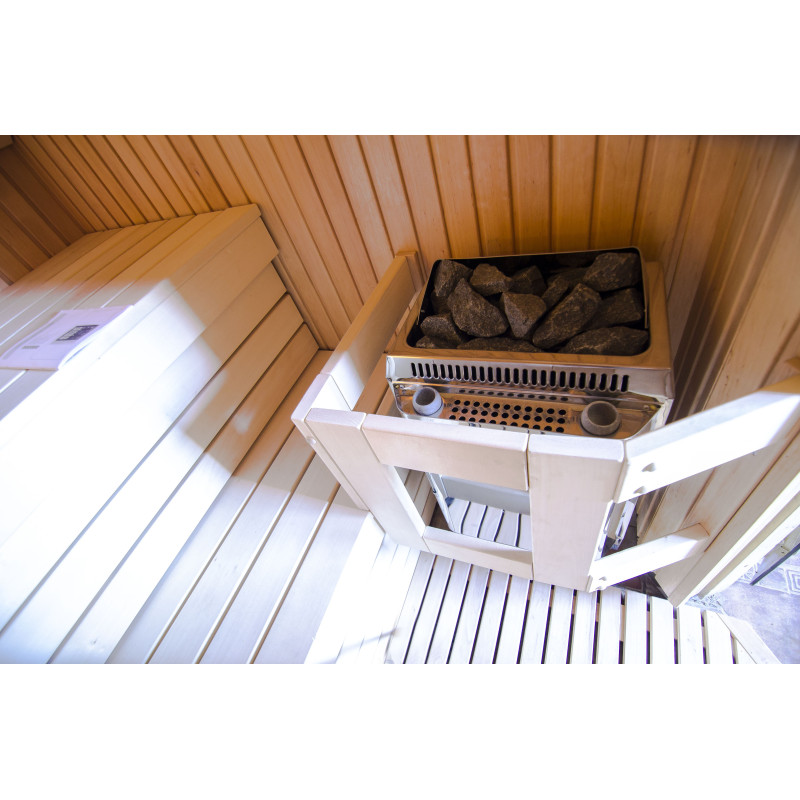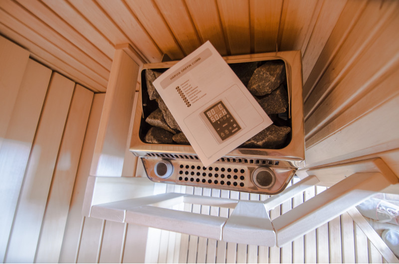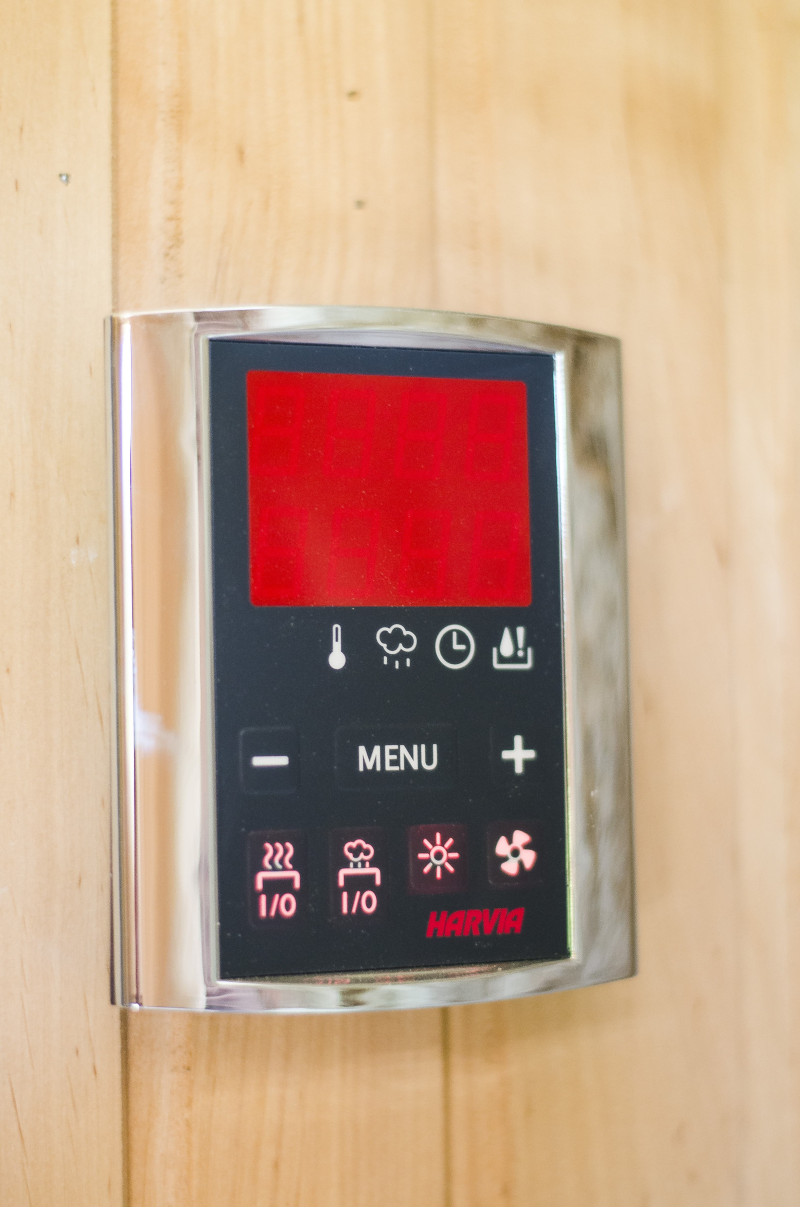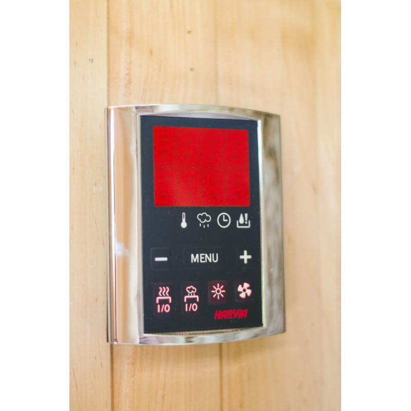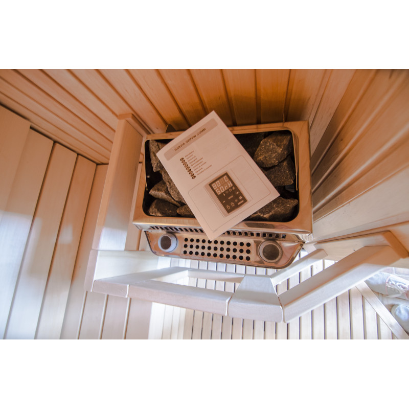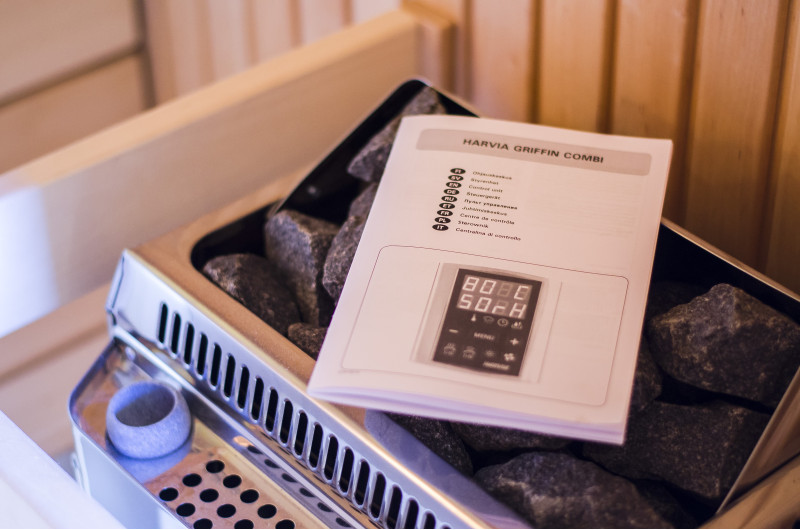 Heater has a separate control unit Harvia Griffin Combi CG170C for controlling the Combi heater and also the heater with evaporator. The control panel is installed outside the sauna room.