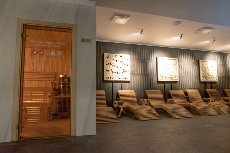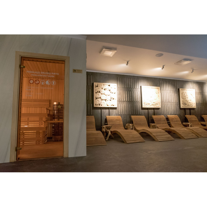 The main highlight of the sauna is the impressive and modern-looking Himalayan salt brick wall. This wall not only delights in its appearance, gives the sauna a cozy atmosphere, but it is also known that the Himalayan salt has many positive properties for human health. Himalayan salt has a positive effect on people with allergies, bronchial asthma, diseases of the nervous system, strengthens the immune system, raises mood and provides energy. Himalayan salt neutralizes electromagnetic radiation, reducing static electricity in the air. The Himalayan salt wall is only further accentuated and beautified by the built-in LED lighting under the bricks.