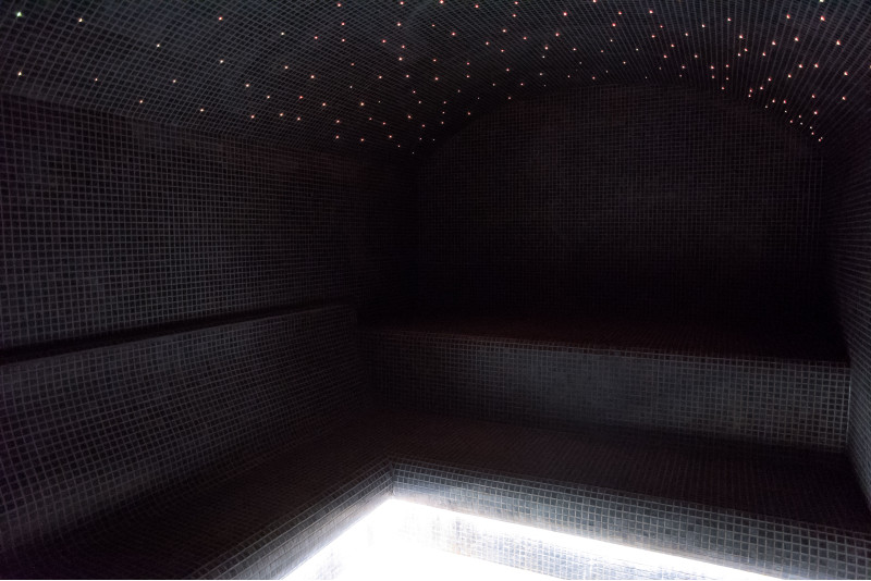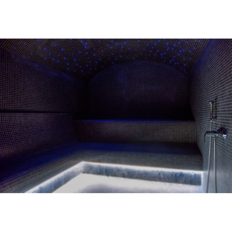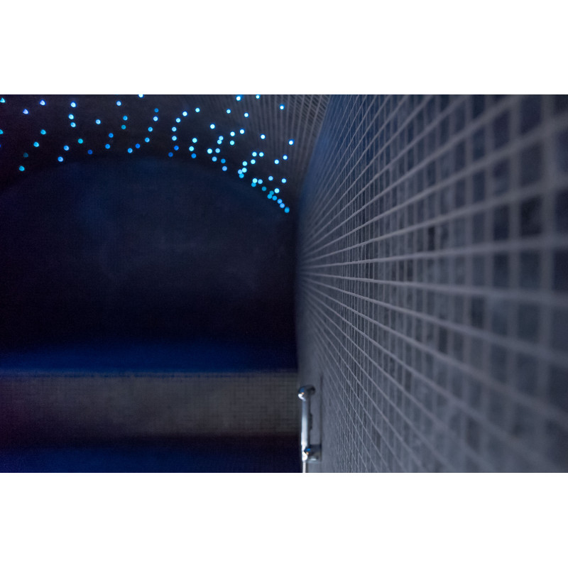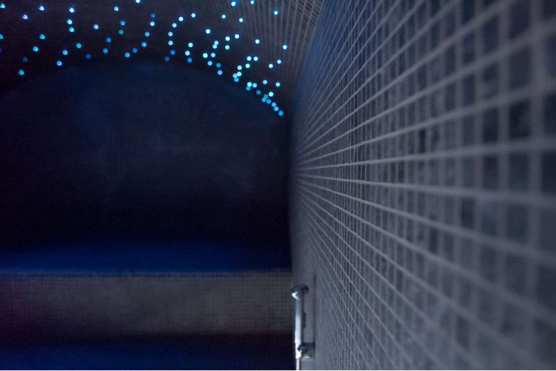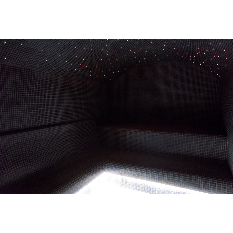 Under the benches - moisture and temperature resistant LED lighting, illuminating the floor. The fiber optic lighting system "Starry Sky" was chosen to illuminate the arched ceiling, the colors of which can be easily and quickly changed with the control panel.