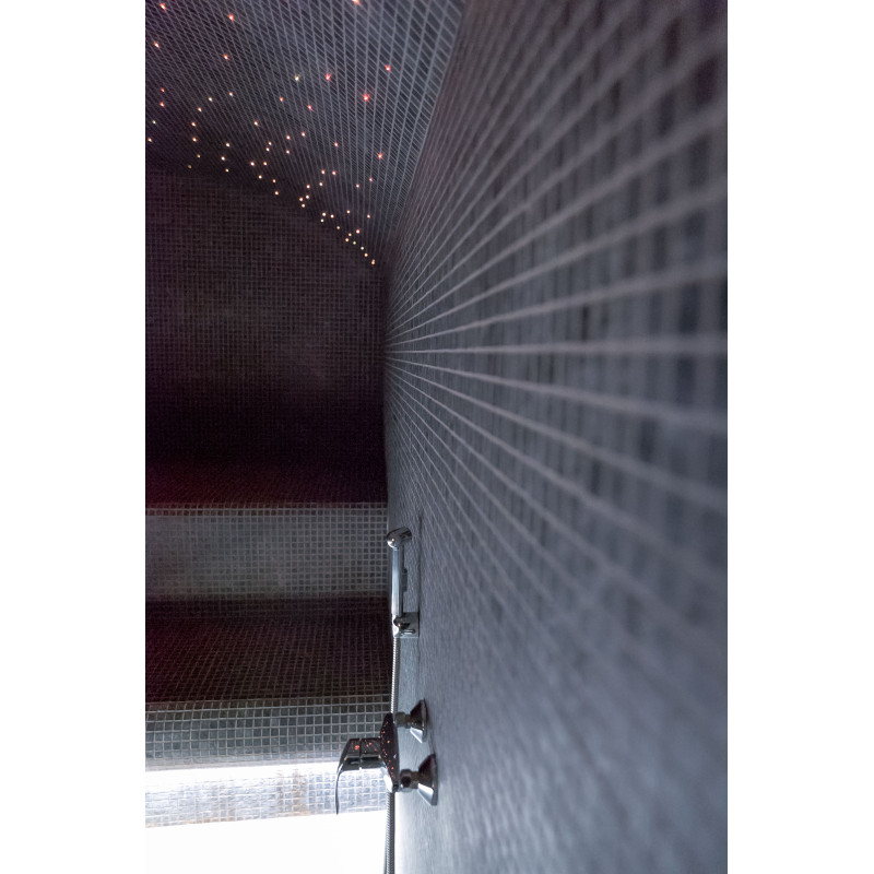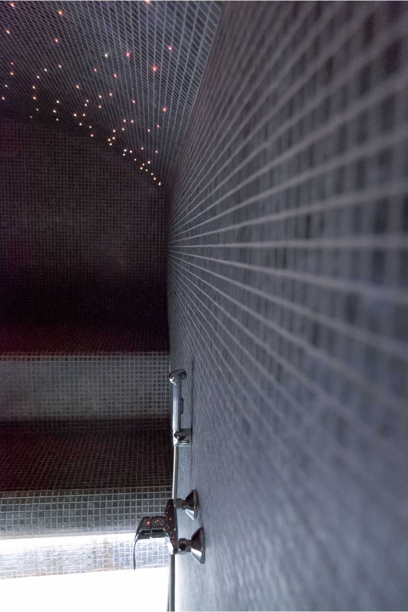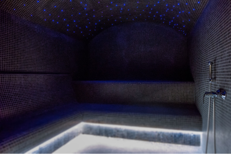 In the steam sauna, polystyrene foam surfaces, ceiling arches and benches are made according to an individual project. The sauna can be enjoyed both lying down and sitting, as there is a backrest on one side of the sauna.