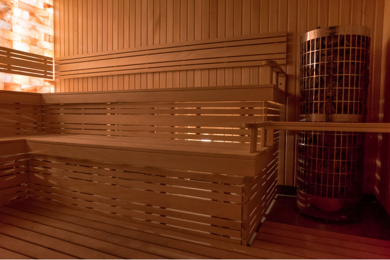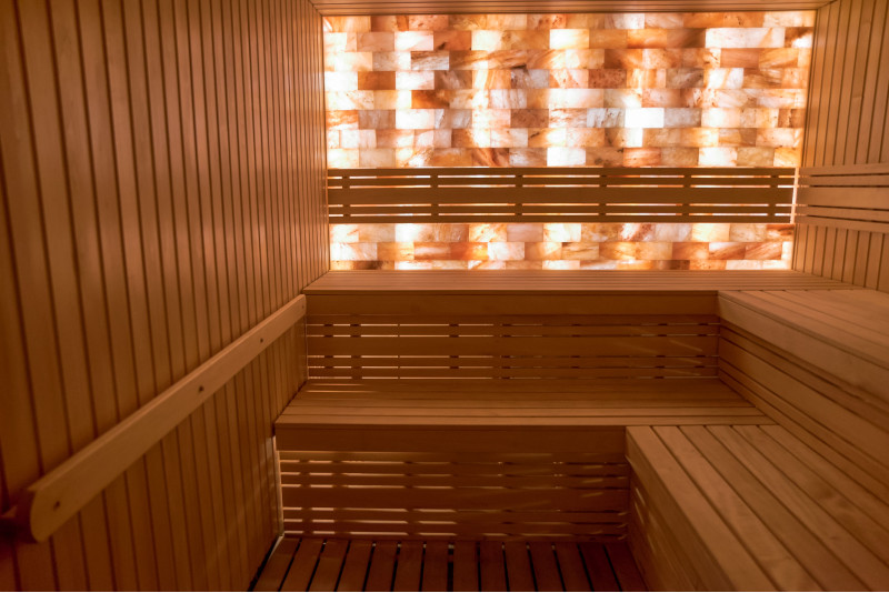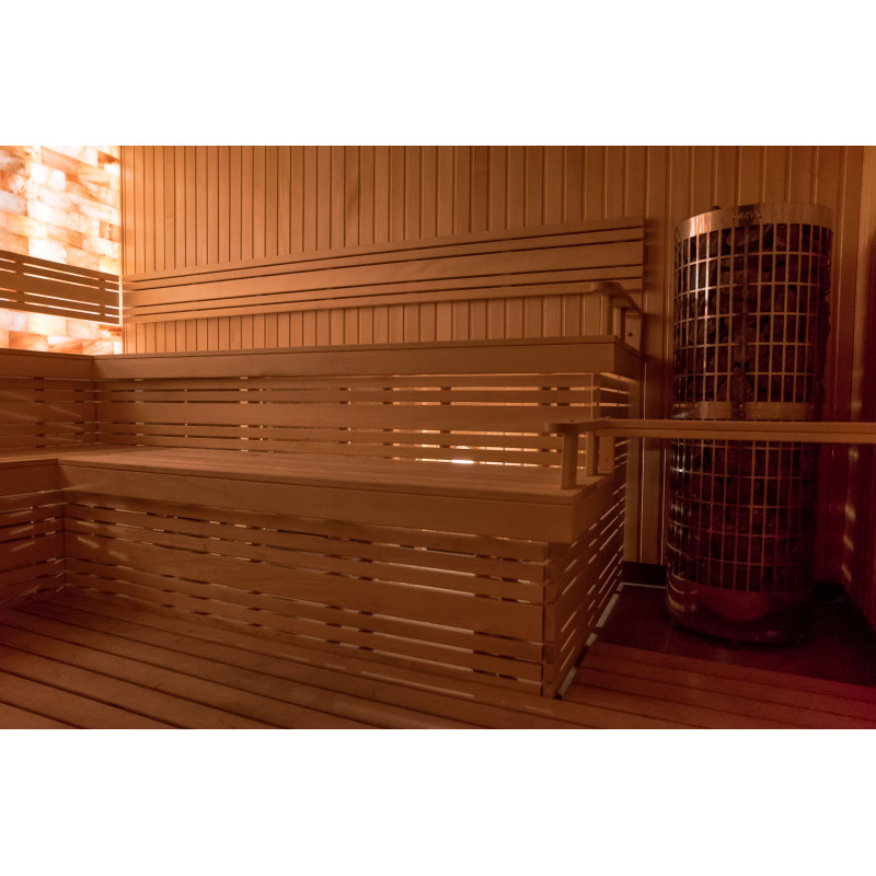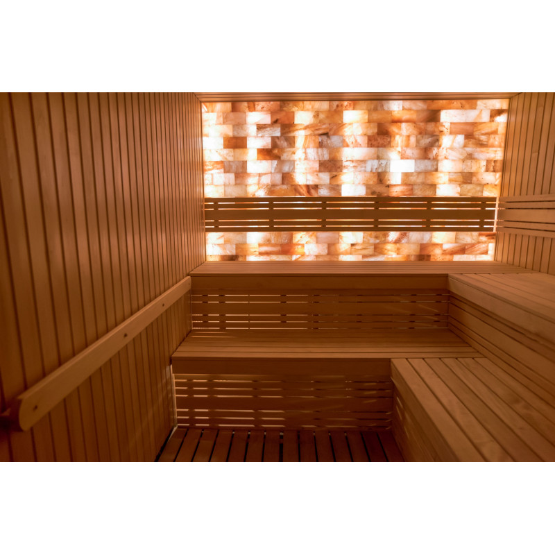 Humidity and temperature resistant 4 lamps and LED lighting behind the Himalayan salt wall were used to illuminate the sauna.