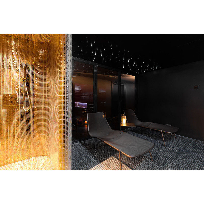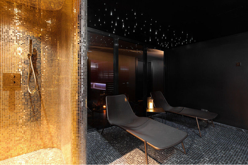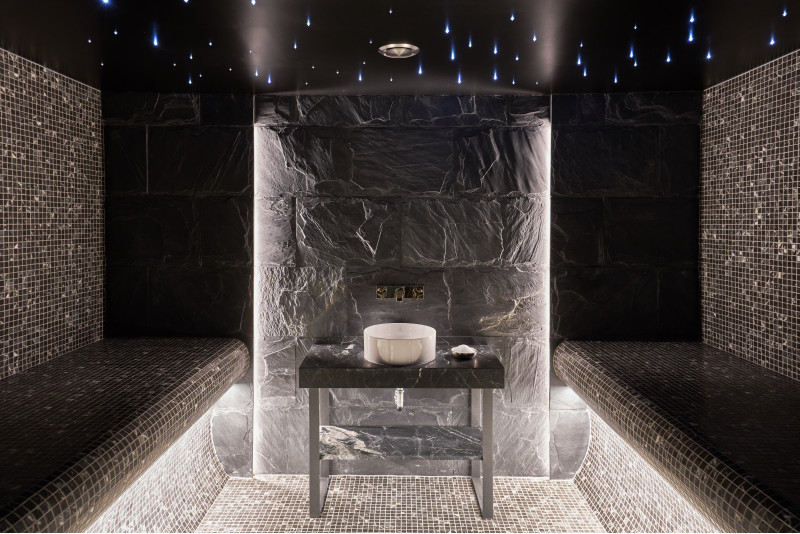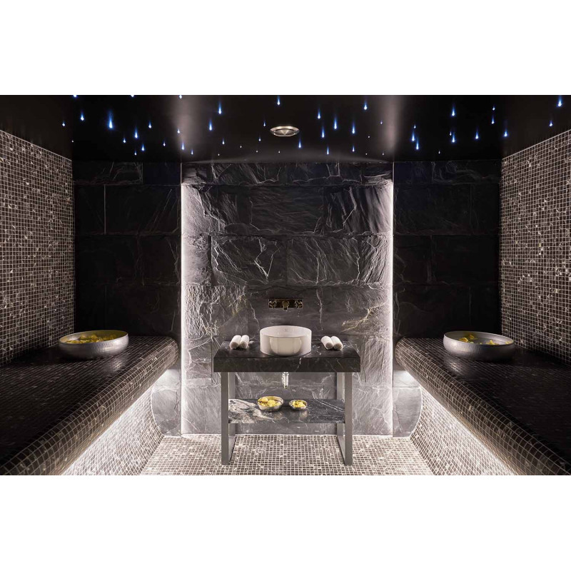 Creating a seamless style, a glass showcase was also chosen for the hammam room. The internal surfaces are formed according to an individual project made of expanded polystyrene using continuous cutting EPS styrene. The walls, floors and benches of the room are heated. The lighting system uses LED RGB IP 67, 9m strips and a fiber optic system "Starry Sky". Glued mosaic tiles, adapted to the curvature and filled with gray Schonox waterproofing.