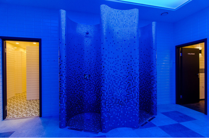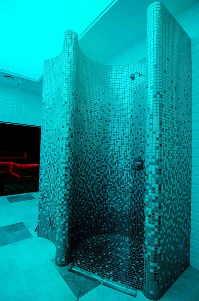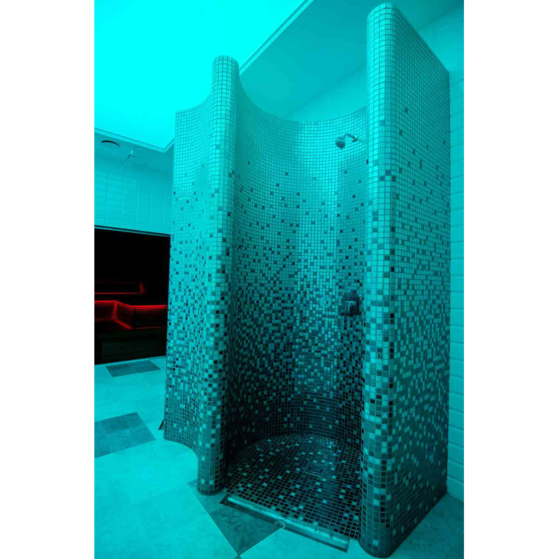 Shower molds are made of XPS 300, using spec. cutting technology according to individual design. Molds mounted, waterproofed with Schonox lubricated waterproofing. Glued mosaic tiles, adapted to the curvature and filled with gray Schonox waterproofing. Showers - for different purposes. One of them - for a simple wash, the other - for cooling down after a sauna, with cold water side jets.