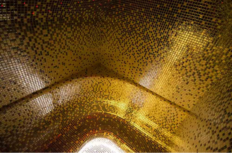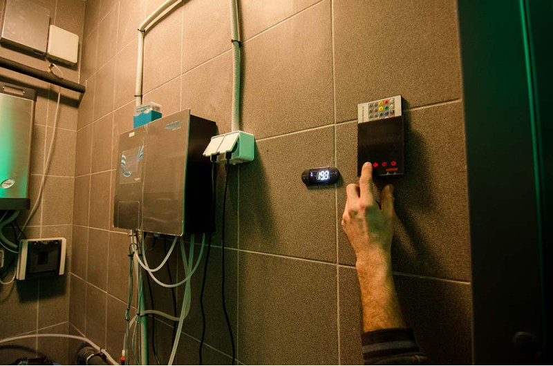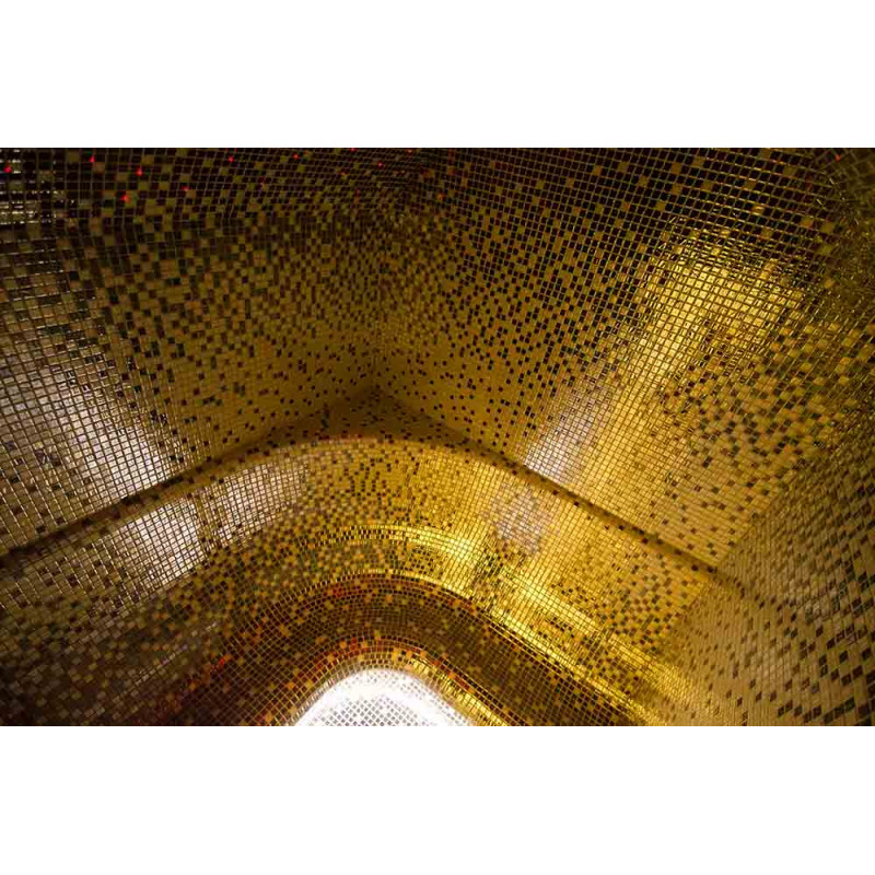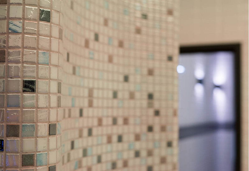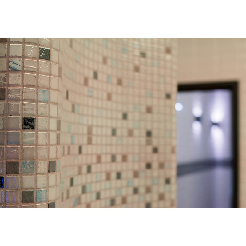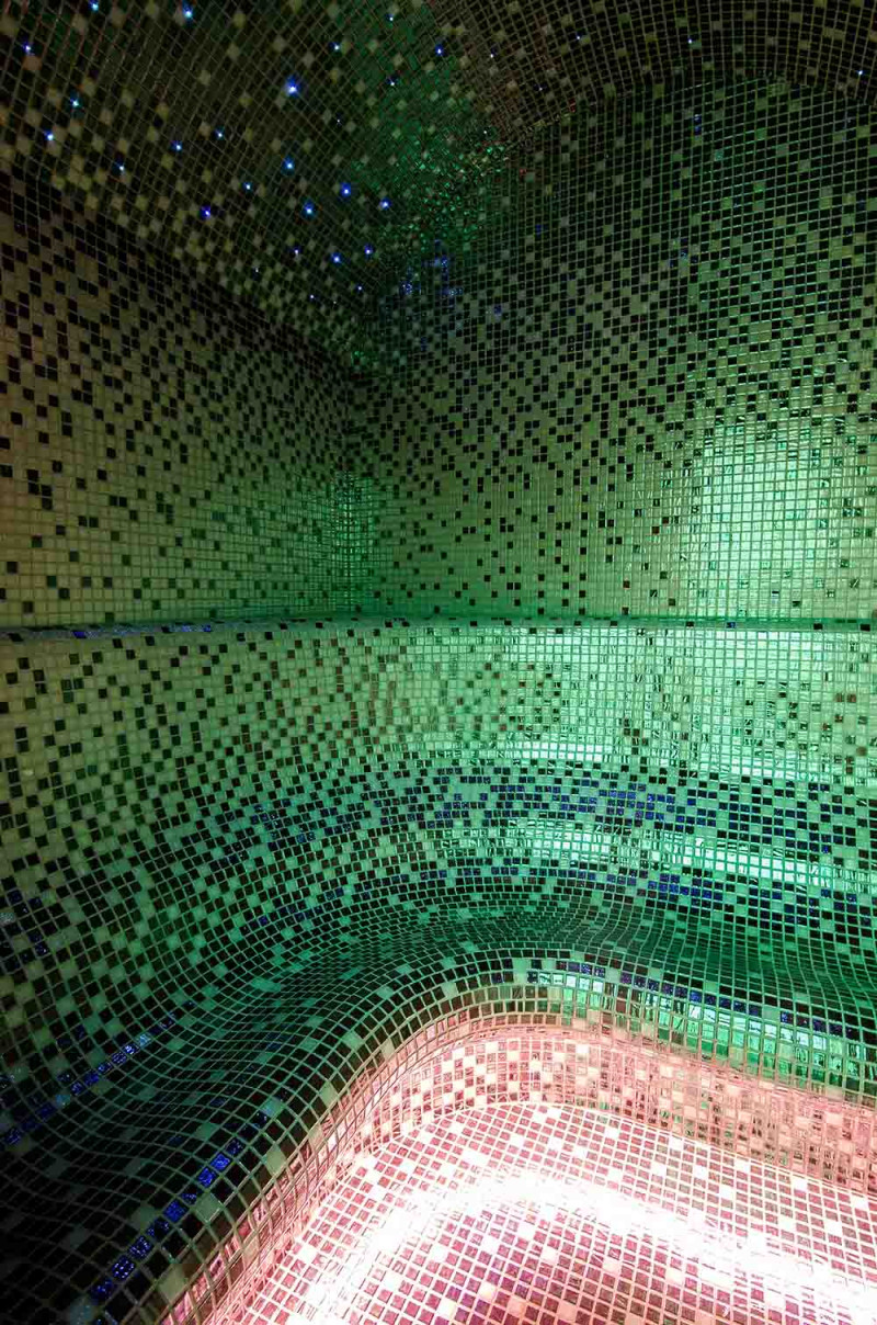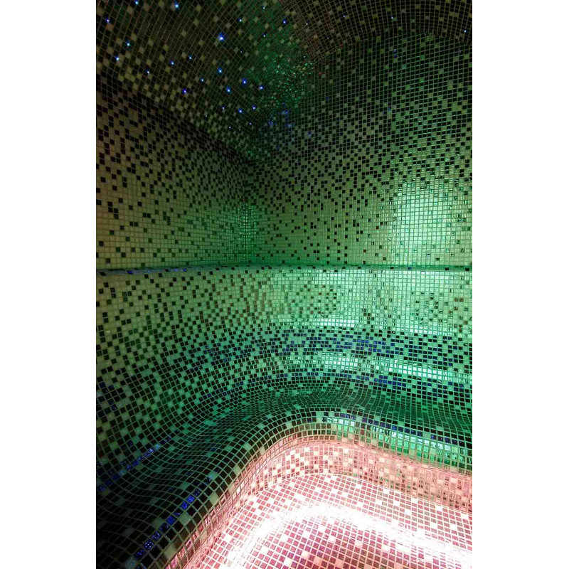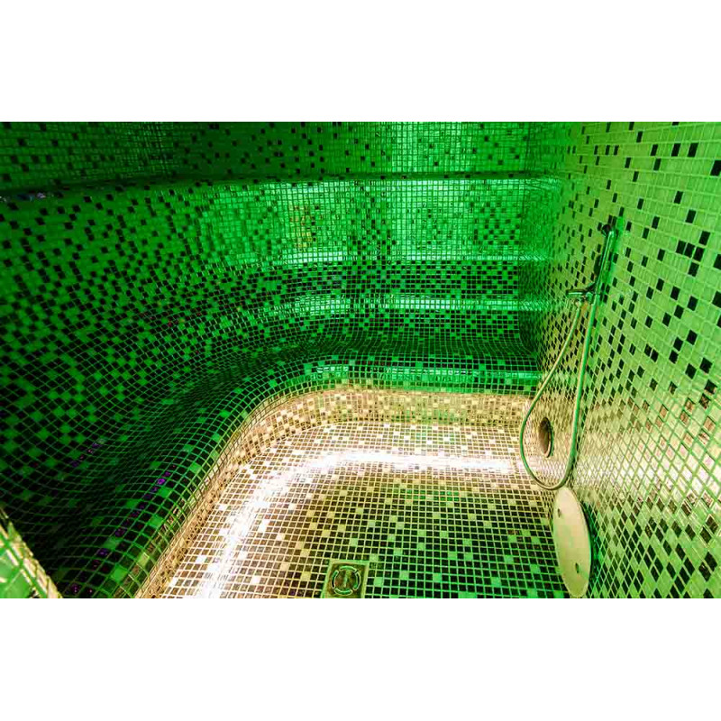 The internal surfaces of the steam bath are formed according to an individual project from expanded polystyrene, using continuous cutting EPS styrene. Glued mosaic tiles, adapted to the curvature and filled with gray Schonox waterproofing. The floor of the room is heated. Doors - aluminum frame, tempered tinted glass. Steam bath equipment: