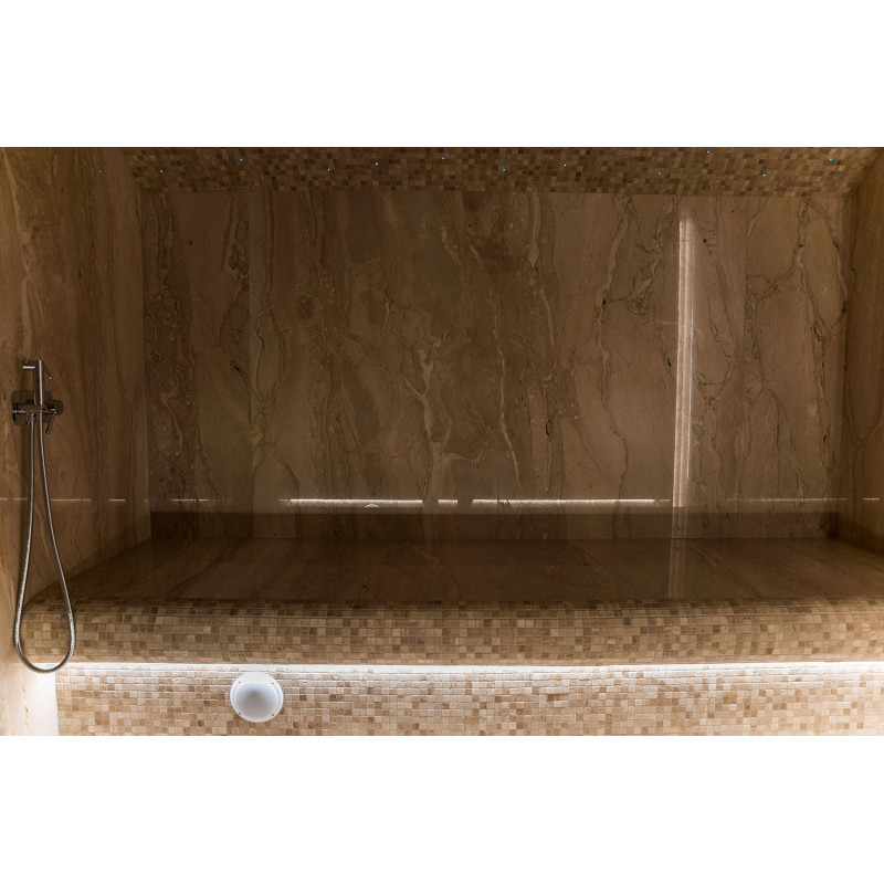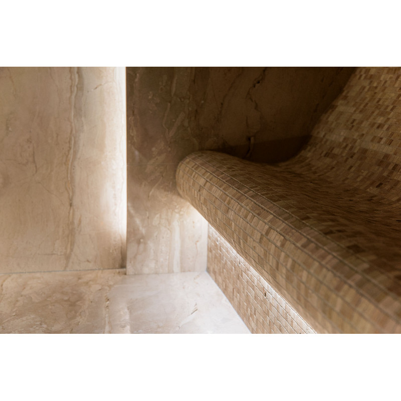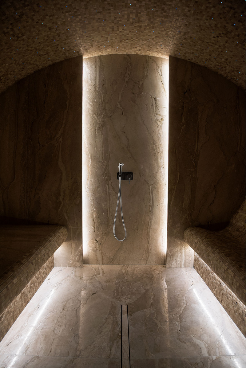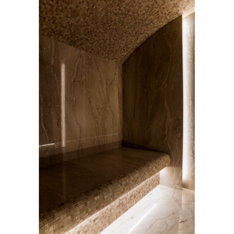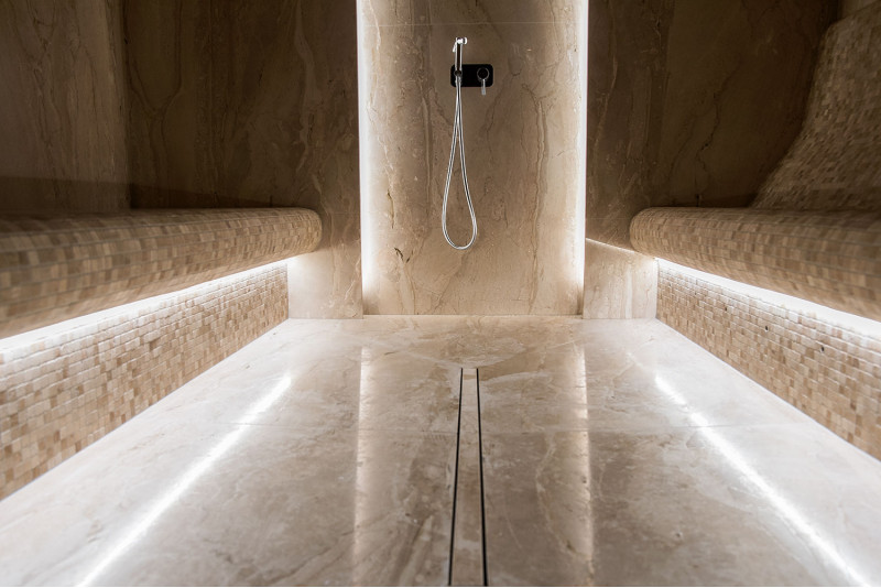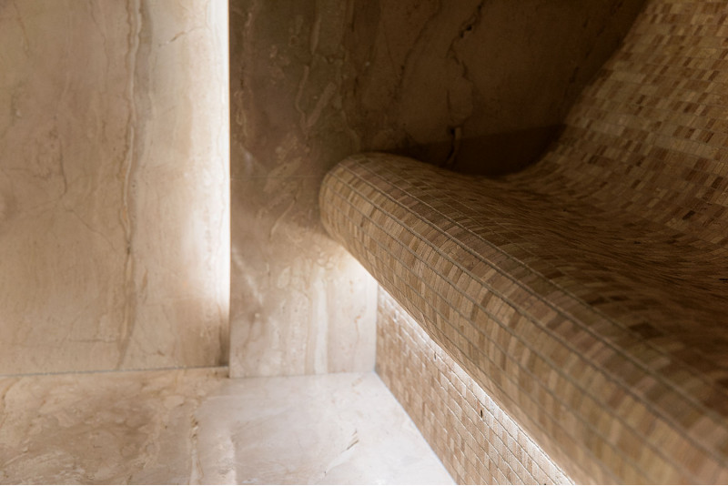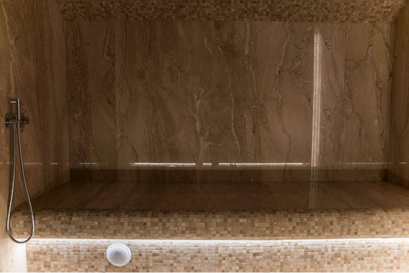 The walls of the steam bath are lined with marble slabs, the beds and ceilings are made of marble mosaic tiles. One of the beds, the wider one is designed to lie down on it, the other one, with a shaped ergonomic curve - for sitting. The sauna is heated by a 9kW Pego steam generator that is controlled by the Fasel touch-sensitive control unit. LED lighting in sauna is under the beds and on the walls, “Žvaigždėtas dangus” system is embedded in the ceiling. The fragrance pump emits a pleasant odor and freshness in the sauna.