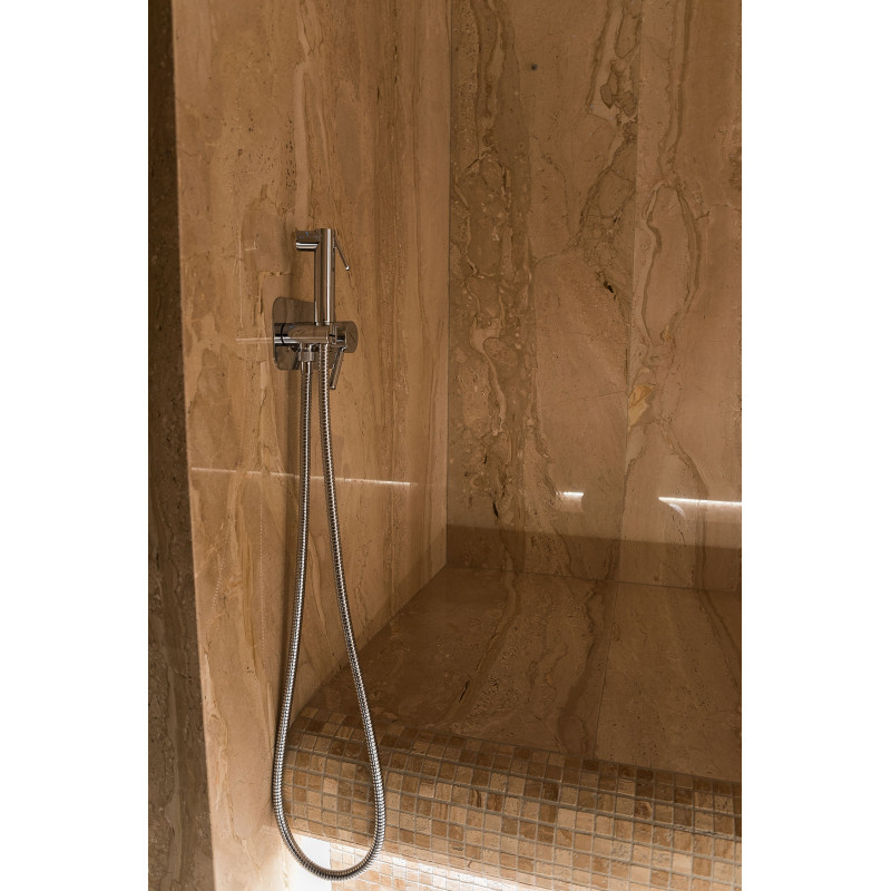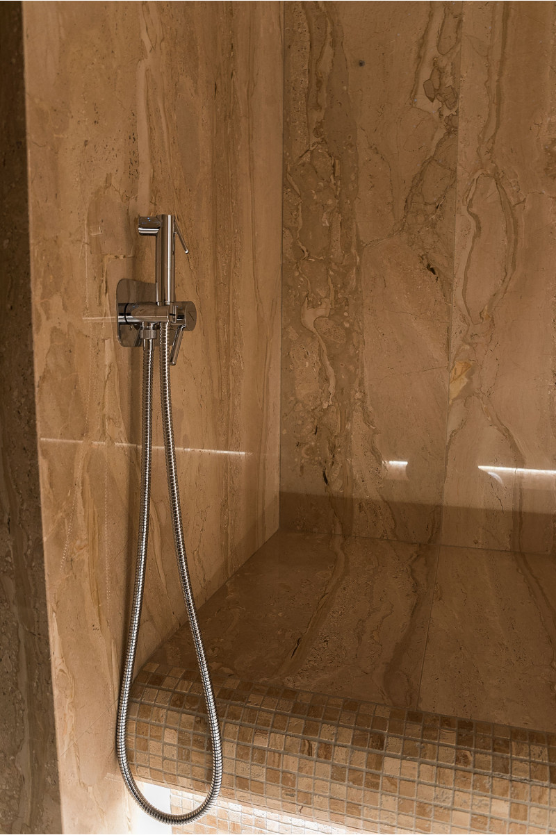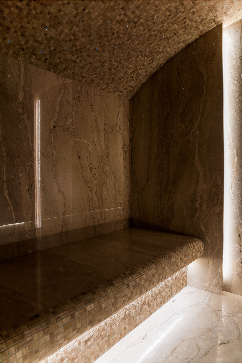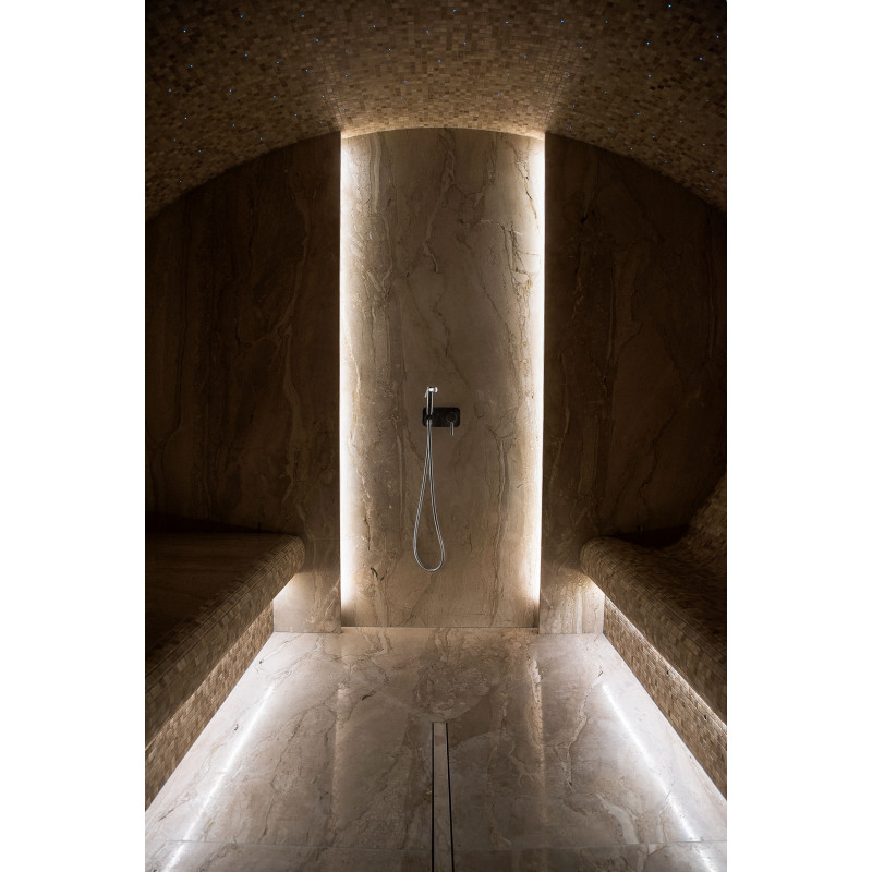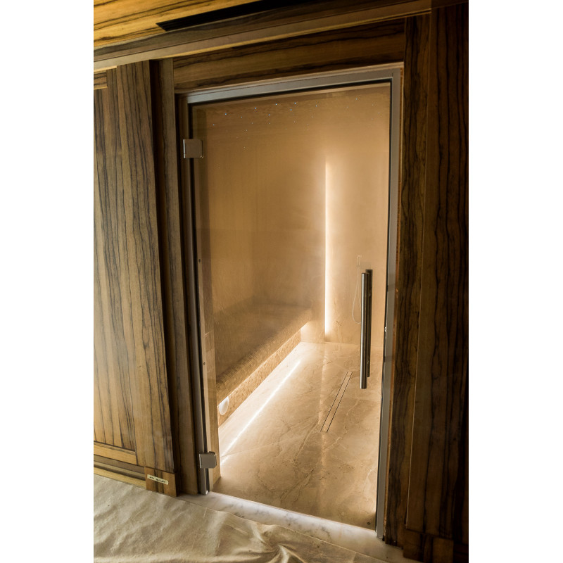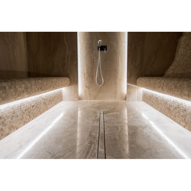 The walls of the steam bath are lined with marble slabs, the beds and ceilings are made of marble mosaic tiles. One of the beds, the wider one is designed to lie down on it, the other one, with a shaped ergonomic curve - for sitting. The sauna is heated by a 9kW Pego steam generator that is controlled by the Fasel touch-sensitive control unit. LED lighting in sauna is under the beds and on the walls, “Žvaigždėtas dangus” system is embedded in the ceiling. The fragrance pump emits a pleasant odor and freshness in the sauna.