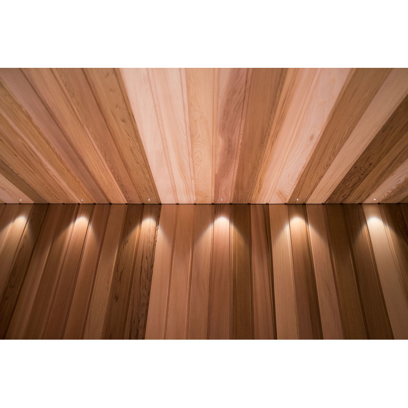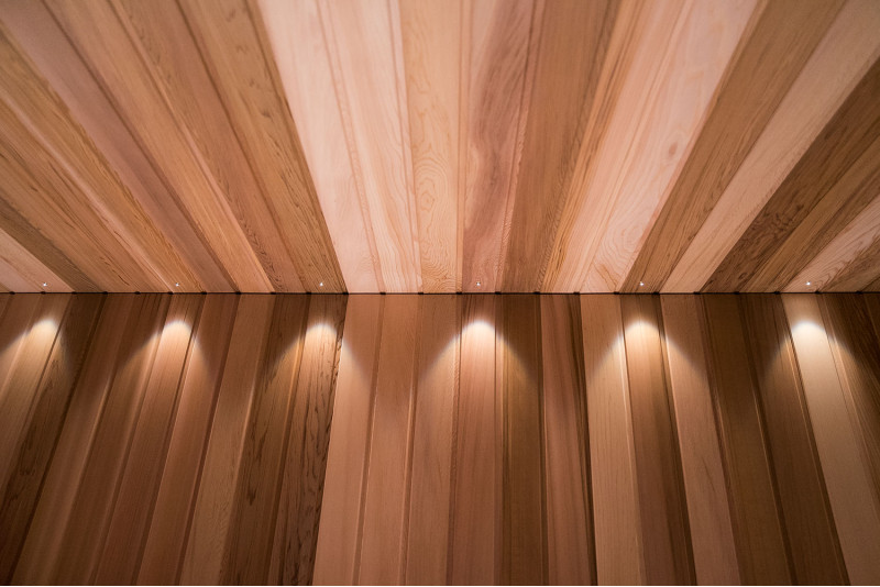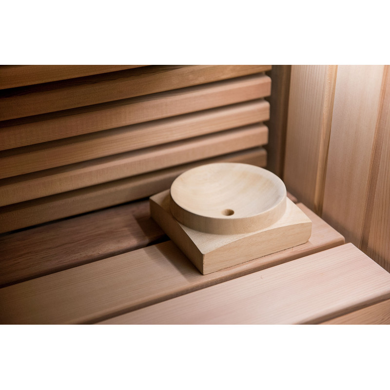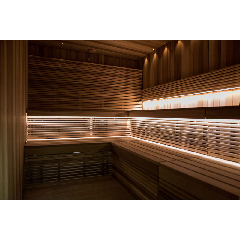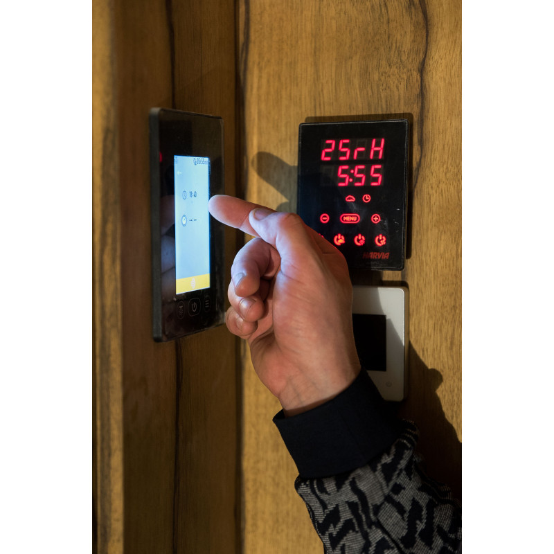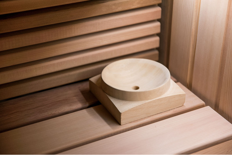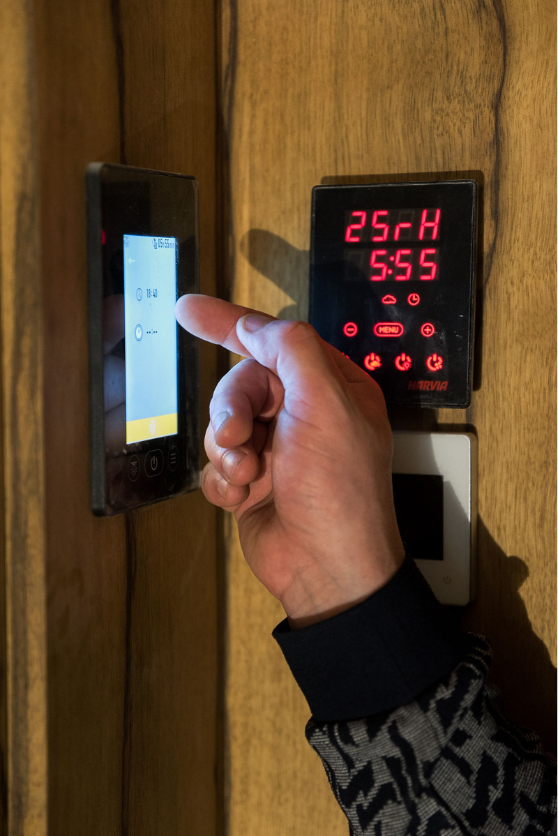 An extremely beautiful wood was chosen for the sauna - red Canadian cedar. Decorative wooden blocks are illuminated by a LED system, the ceiling has an embedded fiber optic lighting kit Cariitti. Under the sauna beds, there is installed The EOS bi-O Mat heater with integrated vaporizer controlled by the Harvia Xenio Combi CX110C control unit.