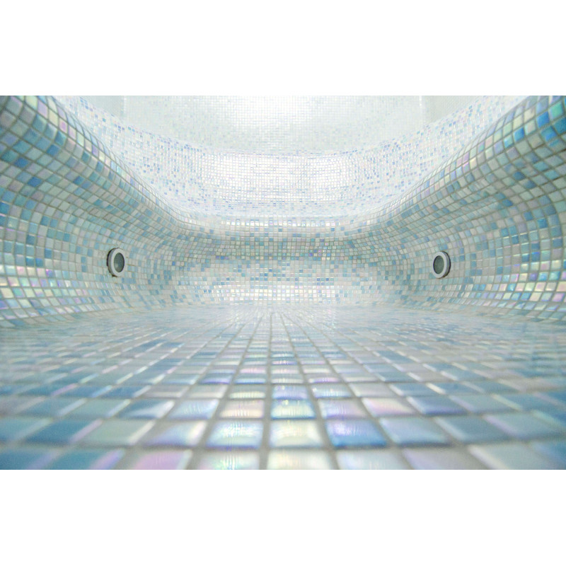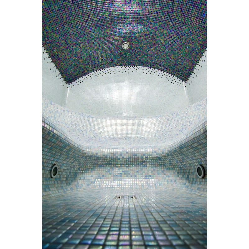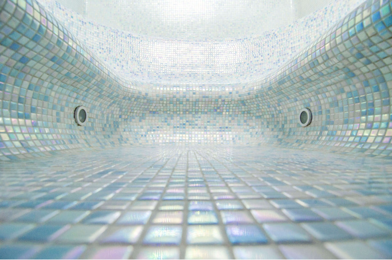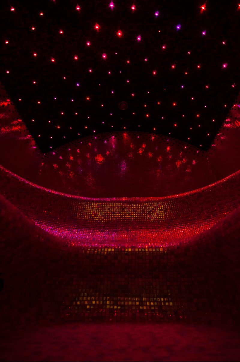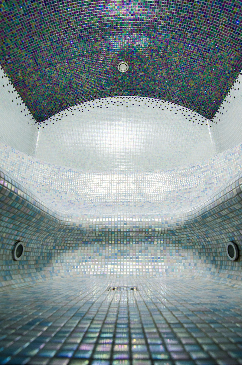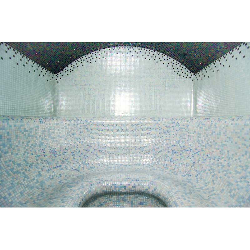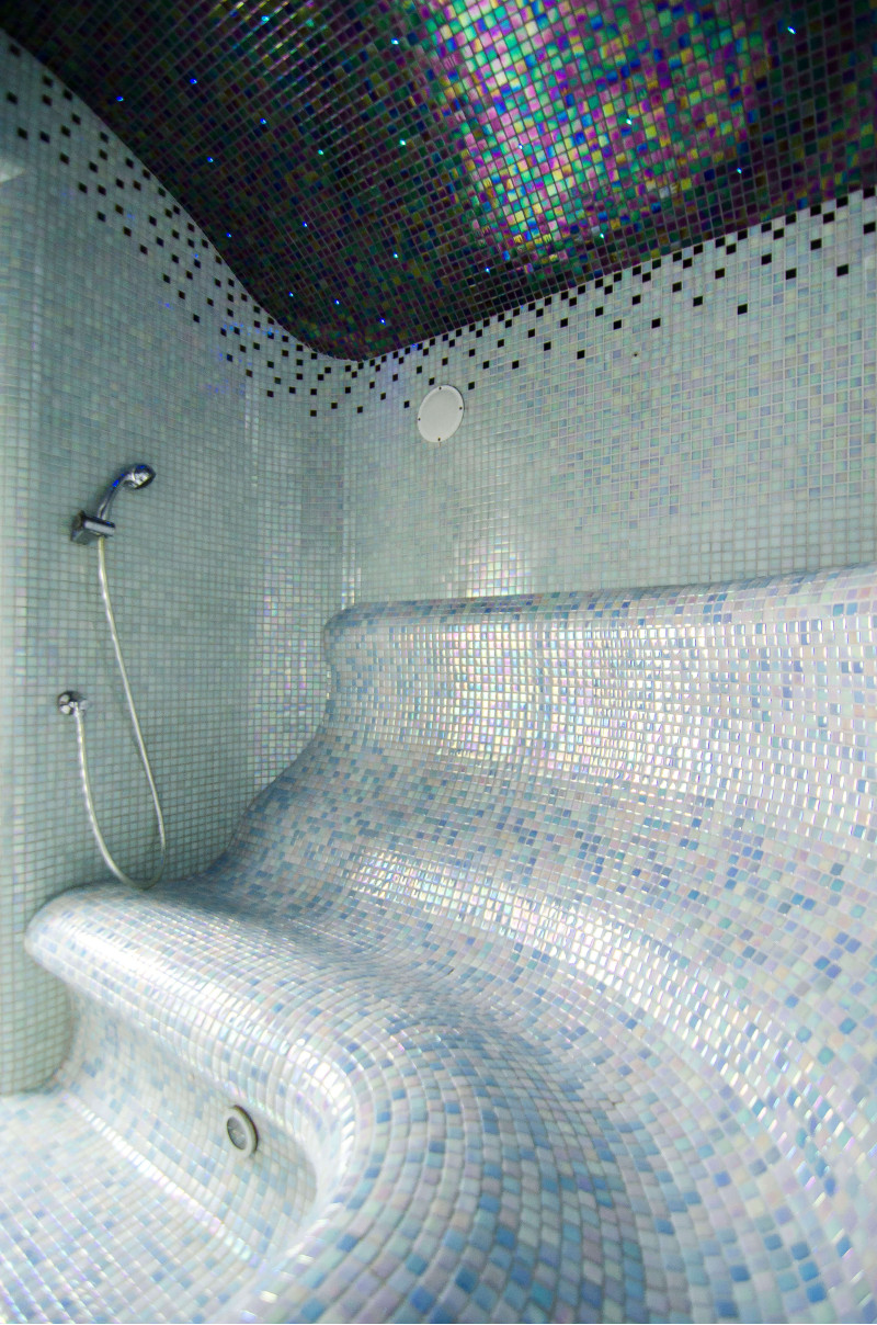 The benches, floors and walls are decorated with pastel-colored mosaic tiles. The ceiling is covered with colored tiles, which together with the ceiling lighting give an even more impressive view.