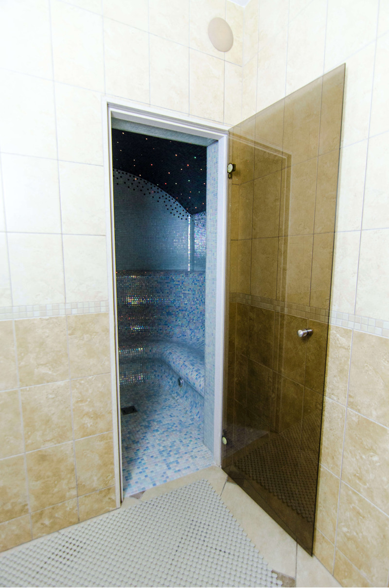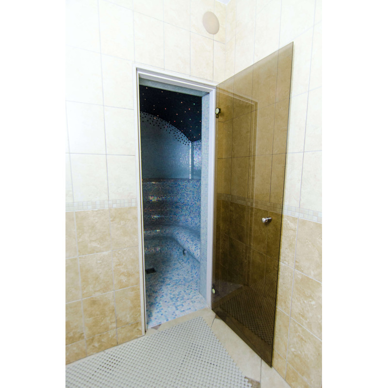Glass doors are made by individual order. The door is resistant to moisture and temperature fluctuations. Door frame - marble.