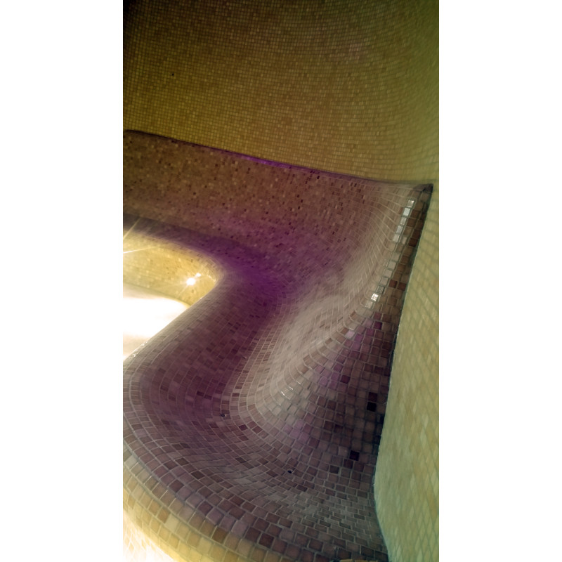 Finishing - floors, walls, benches decorated with crushed glass mosaic tiles.