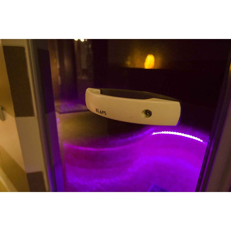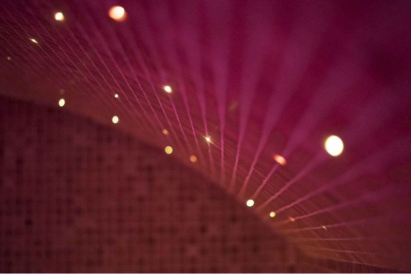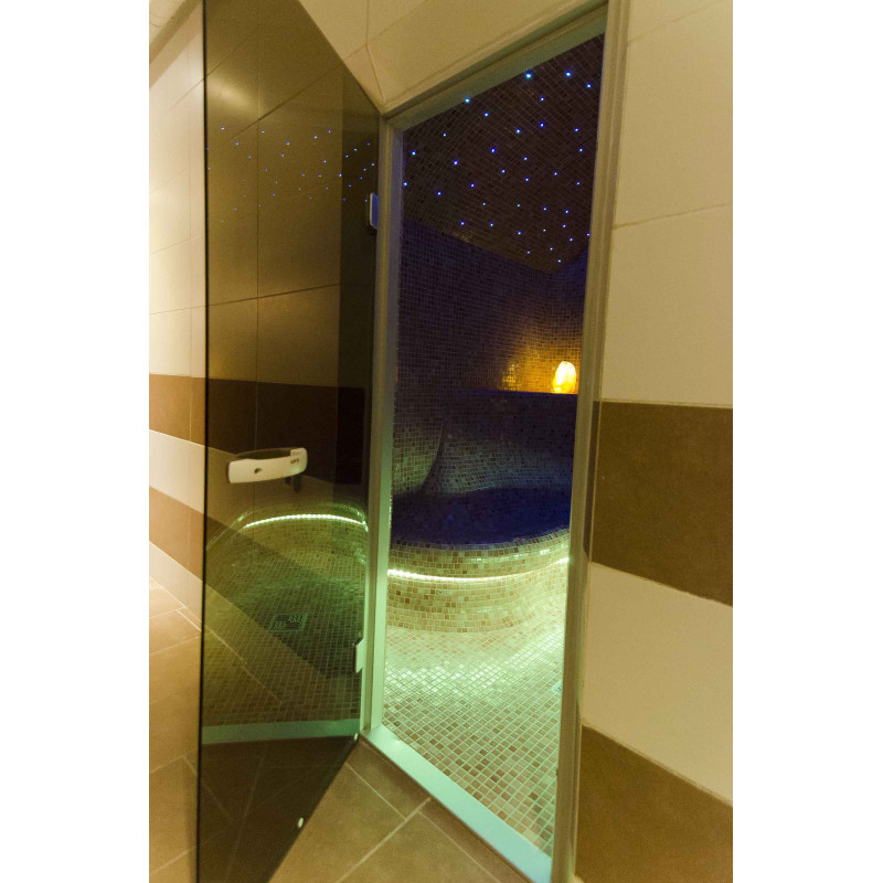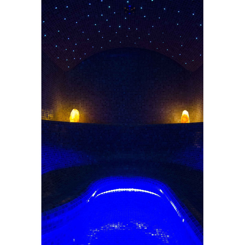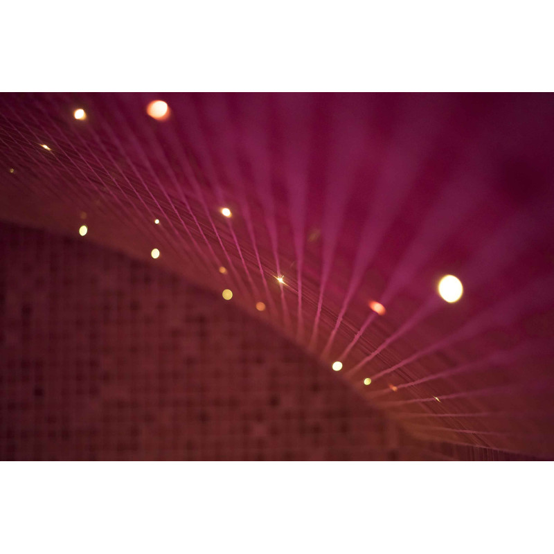 Lighting system - the ceiling is illuminated with a fiber optic lighting system "Starry Sky". Fiber optic lighting is a long-lasting, versatile, economical and simple solution. Thanks to it, you can extract the most impressive lighting options. The "Starry sky" creates a cozy environment and perfectly complements the experience of warming up in the sauna. Under the benches, there is colored lighting to illuminate the floor. Colors can be changed.