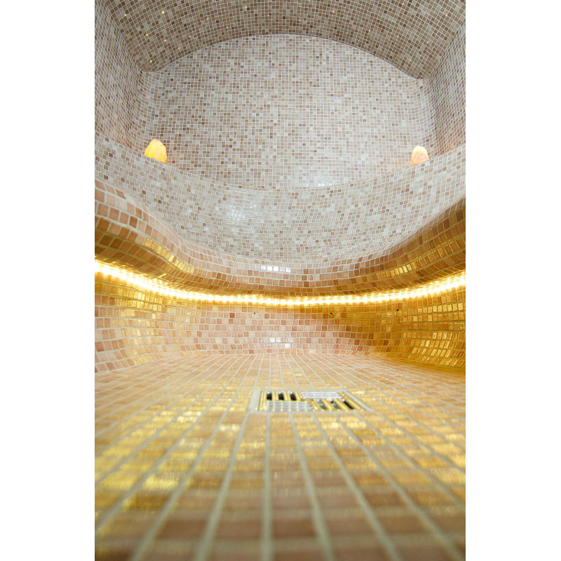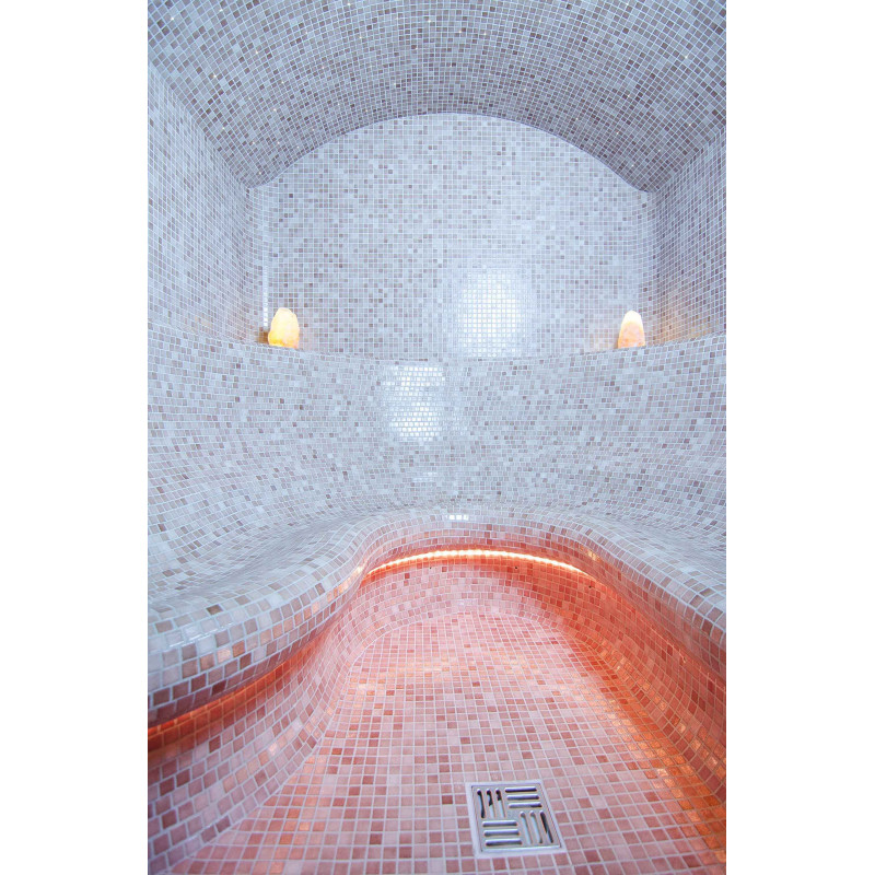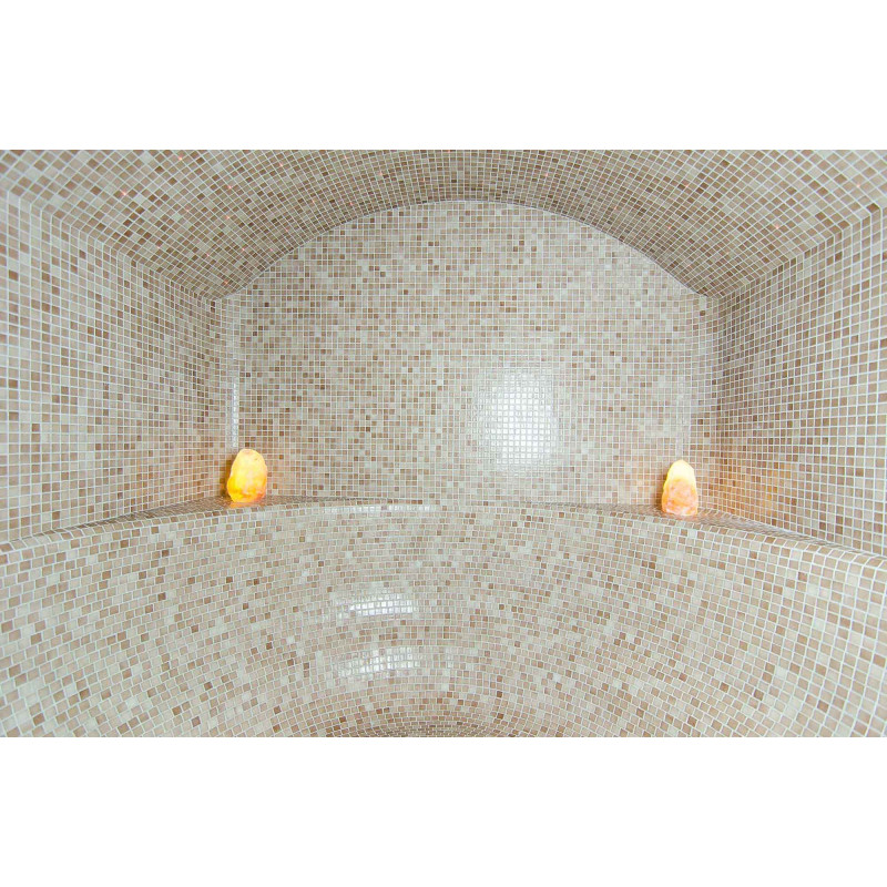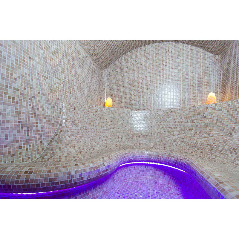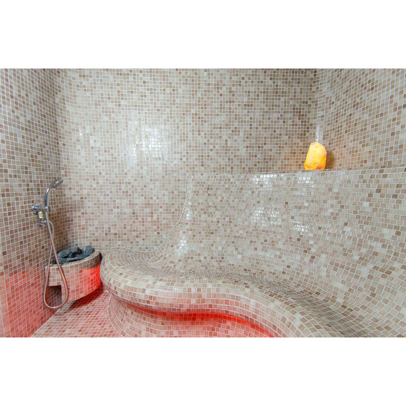 Finishing - sauna floors, walls, ceilings and benches are decorated with small crushed glass mosaic tiles.