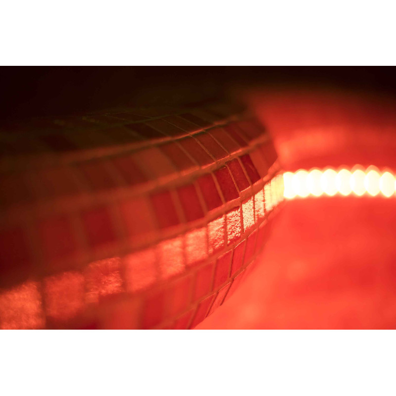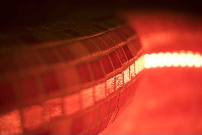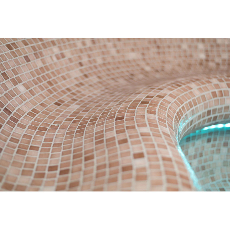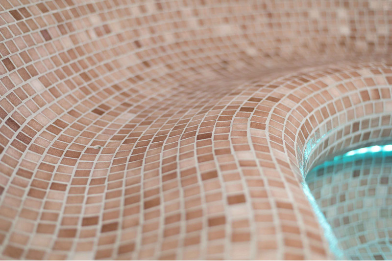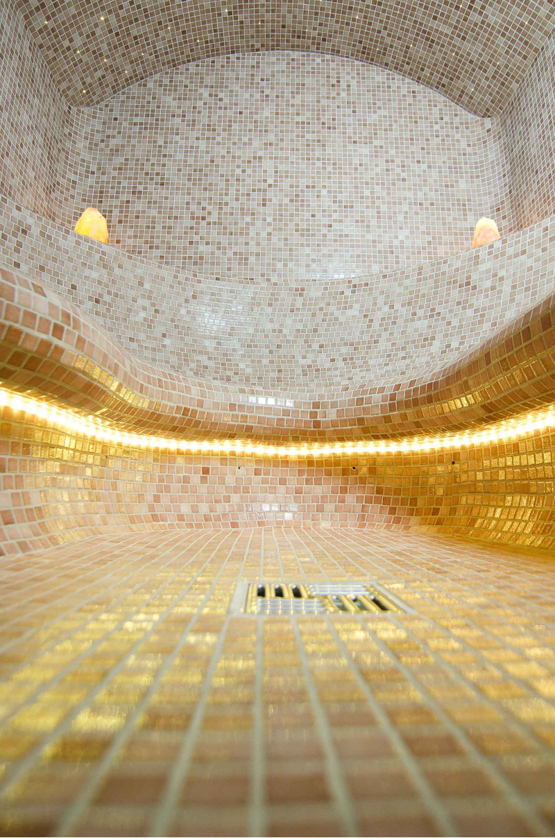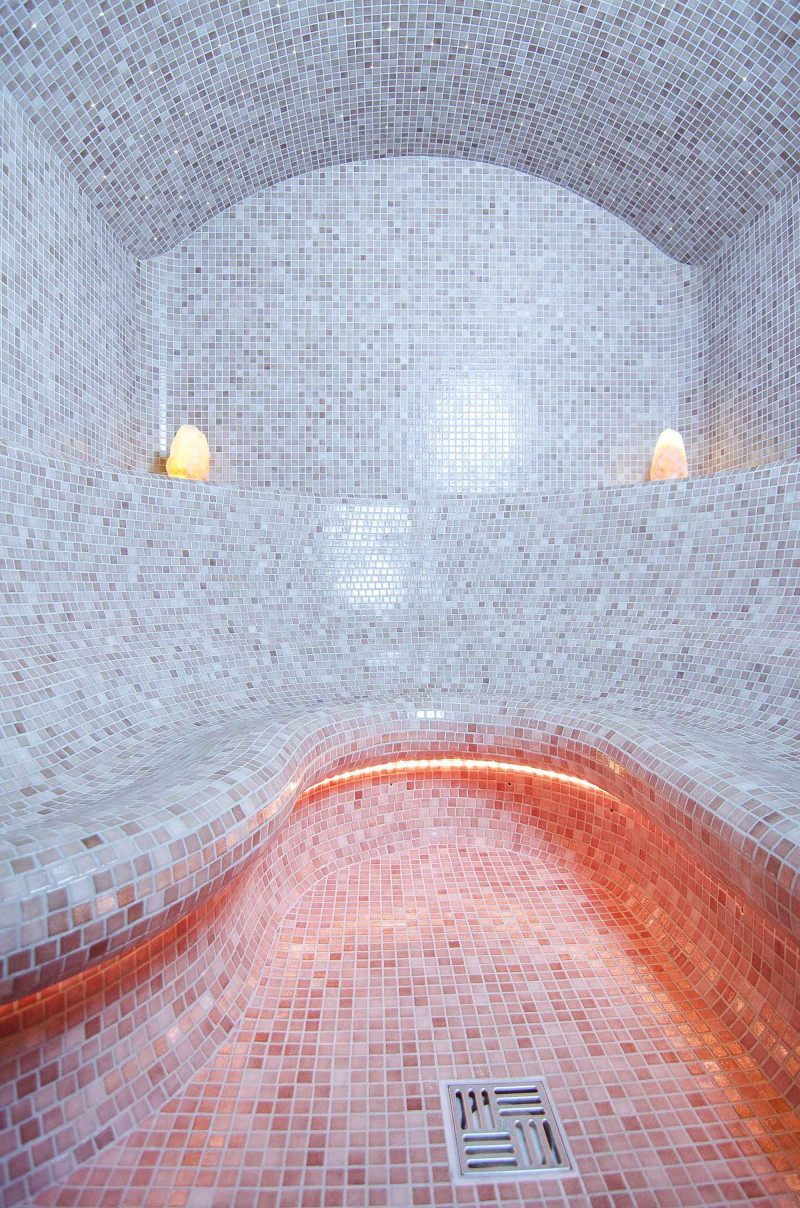 Finishing - sauna floors, walls, ceilings and benches are decorated with small crushed glass mosaic tiles.