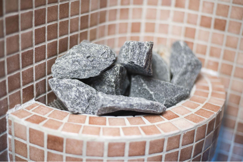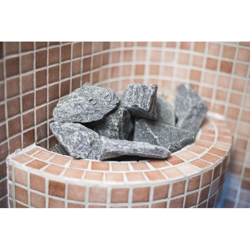 The sauna is equipped with a steam vase, which performs the function of a steam protection pipe, through which steam enters the sauna. Decorated with olivine diabase stones.